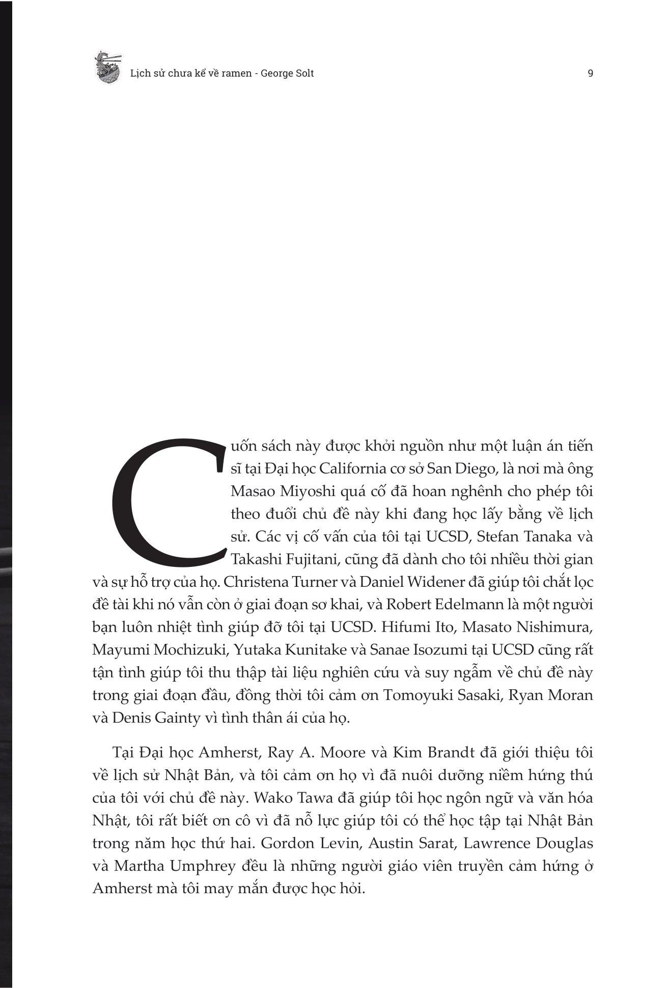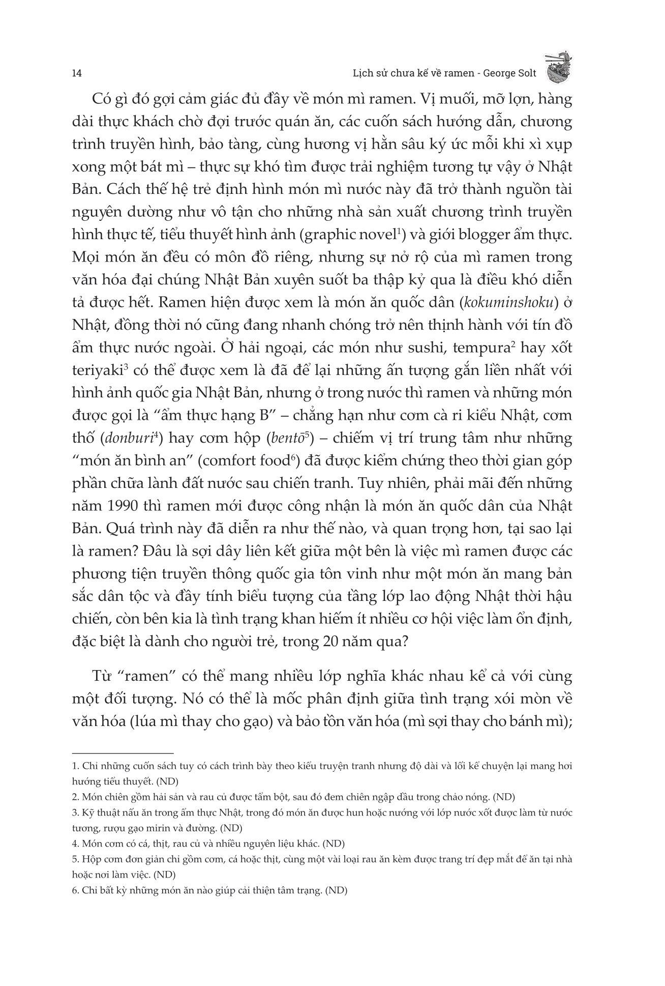 Vượt ra khỏi những bát nước dùng và sợi mì thơm ngon, George Solt đã kể lại cuộc hành trình biến đổi của mì ramen từ nguồn gốc khiêm tốn ở Trung Quốc cho đến một thương hiệu toàn cầu đại diện cho ẩm thực Nhật Bản trong Lịch Sử Chưa Kể Về Ramen - Biến Động Chính Trị Tại Nhật Bản Đã Tạo Ra Một Kỳ Tích Ẩm Thực Toàn Cầu Như Thế Nào?. Đây không chỉ là lịch sử của một món ăn được yêu thích, cuốn sách phản ánh quá trình tái thiết sau chiến tranh của Nhật Bản, những điều kỳ diệu về kinh tế và nhịp đập của xã hội Nhật Bản. George Solt đã mang đến một hành trình toàn diện và khai sáng vào thế giới ramen, giúp độc giả đánh giá lại món mì nổi tiếng với một sự tôn trọng mới dành cho lịch sử phong phú của nó.