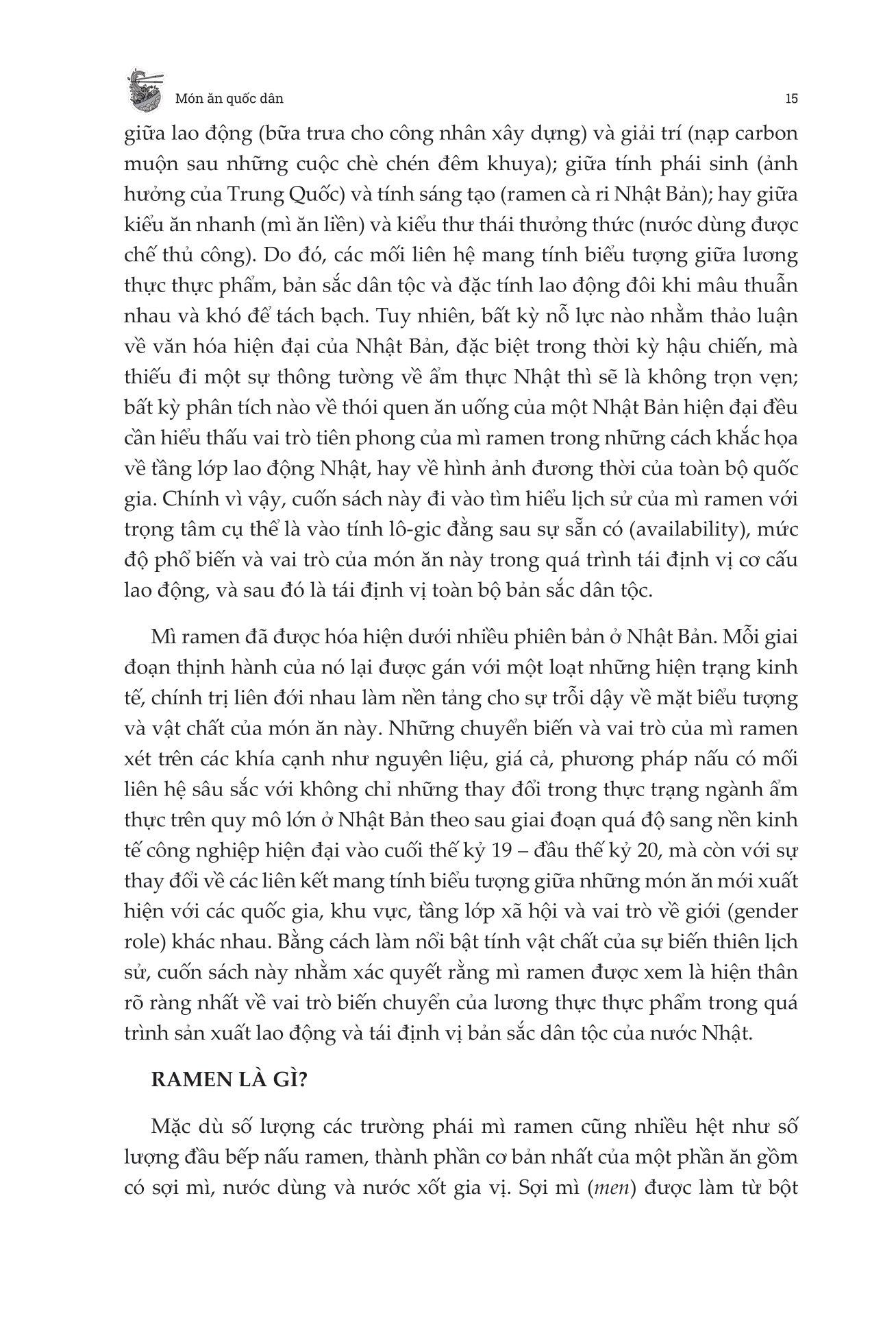 Đi sâu vào câu chuyện nơi mì ăn liền trở thành biểu tượng của sự hiện đại, các biến thể vùng miền vẽ nên bức tranh đa dạng về văn hóa và các cửa hàng ramen nhộn nhịp như những nhân chứng thầm lặng cho dòng thời gian đang thay đổi. Cuốn sách đặt ramen dưới một góc nhìn hoàn toàn mới, không chỉ là món ăn tiện lợi mà còn là minh chứng cho khả năng phục hồi và đổi mới của một quốc gia. Tác giả sử dụng món mì như một lăng kính để khám phá các chủ đề chính trị xã hội rộng lớn hơn trong lịch sử Nhật Bản, chẳng hạn như ảnh hưởng của Mỹ sau chiến tranh, phép màu kinh tế của Nhật Bản cũng như những cuộc đấu tranh và chiến thắng của quốc gia này. Qua đây, người đọc có thể hiểu được chiều sâu lịch sử, ý nghĩa văn hóa đằng sau một bát mì tưởng chừng đơn giản.