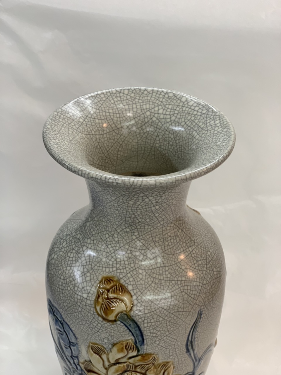 Trên tay cặp Lộc Bình Hoa Sen Men Rạn Đắp Nổi cao 50 cm giá chỉ 2xxx / cặp - Vua Lộc Bình Bát Tràng