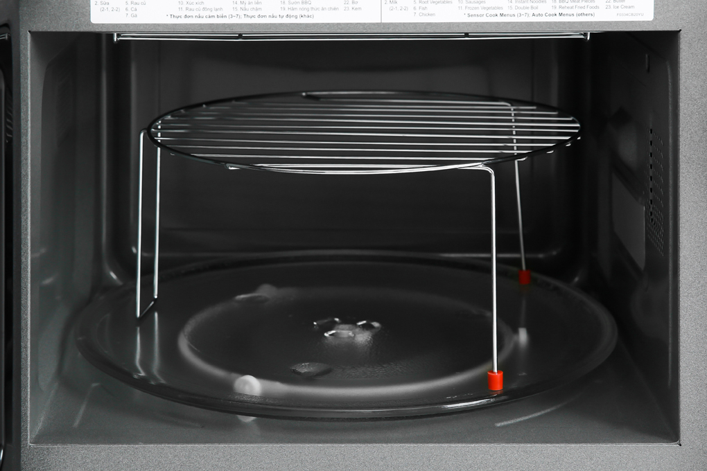 Đi kèm lò có vòng xoay, đĩa thủy tinh, giá nướng hỗ trợ xoay món ăn đều trong lò, cho thức ăn nóng ngon đúng chuẩn