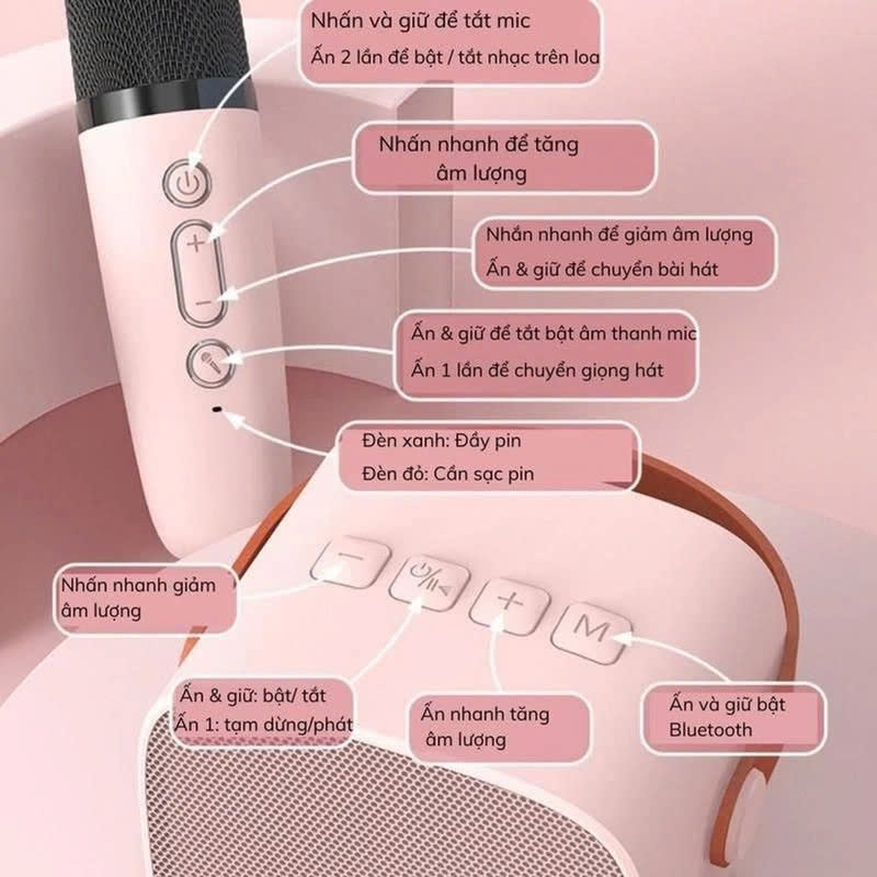 Chức năng chính: nghe nhạc, làm loa phát nhạc, loa thông báo, Hát Karaoke trên điện thoại ghi âm bài hát đã thể hiện. Kết nối: Bluetooth, USB, MicroSD Màu: Hồng, Vàng, Đen
