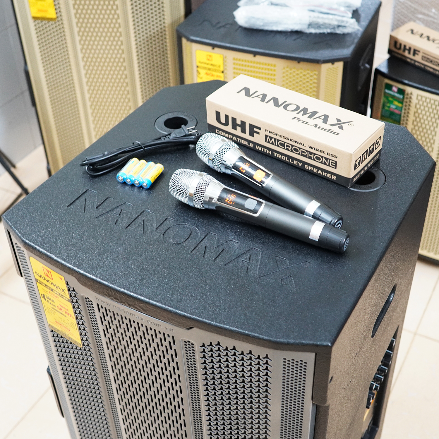 • Loại: Karaoke di động • Số đường tiếng: 03 • Công suất: 1150W • Thời gian sạc: 7 tiếng • Thời gian dùng: 4-7 tiếng • Loa Bass: 50cm • Loa Mid: 16cm • Loa Treble: Treble còi • Kết nối không dây: Bluetooth 5.0 • Micro: Không dây band tần UHF • Tiện ích: Cổng USB, thẻ nhớ, mic có dây 6.5 x2; Jack guitar 6.5, Audio In/Output 3.5 • Kích thước/ Trọng lượng: (50.5 x 53 x 89)cm / 46kg • Chất liệu thùng: Gỗ sơn gai chống trầy • Sản xuất tại: Việt Nam • Thương hiệu: Nanomax • Sử dụng nguồn: AC 220V hoặc Ắc qui 12V/20A • Phụ kiện: 1 dây sạc, 2 micro, 4 pin và 1 hướng dẫn