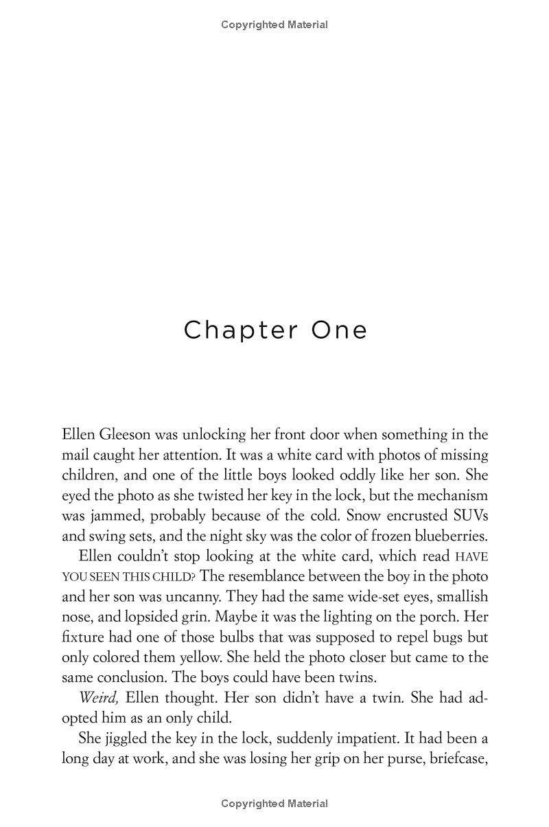 The child in the photo looks exactly like Ellen's adopted son, Will. But how could it be if the adoption was lawful? Everything inside her tells her to deny what she sees. But Ellen won't rest until she finds out the truth. And she can't shake the question: If Will rightfully belongs to someone else, should she keep him or give him up?