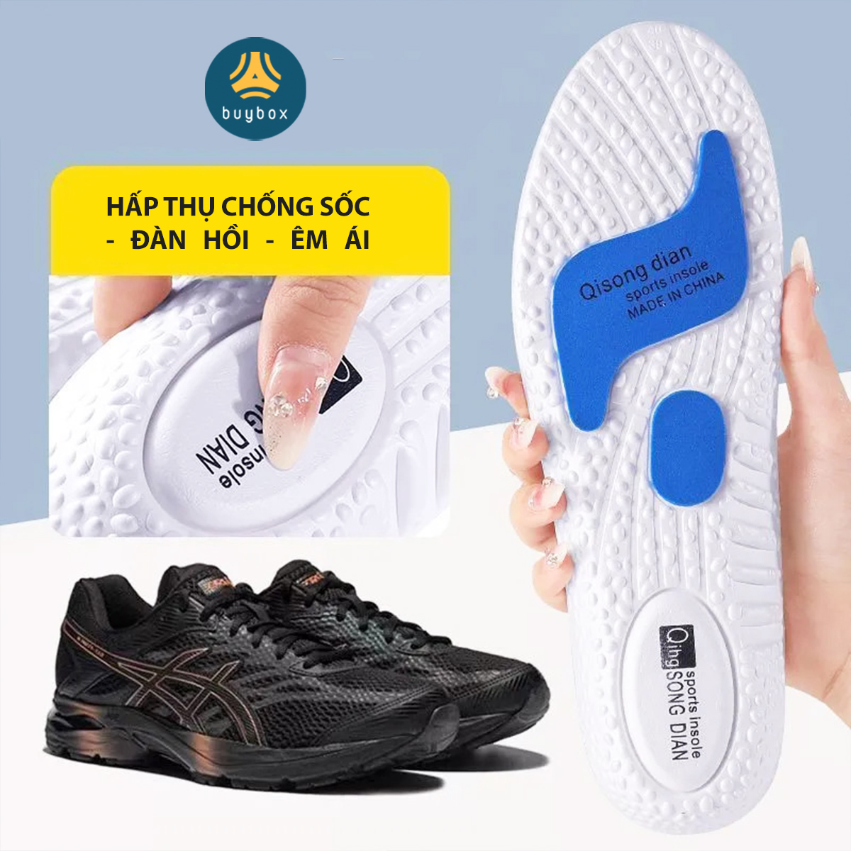 Lót giày thể thao EVA có thiết kế 4D vòm cong lồi-lõm ở mặt trên và bổ sung ốp giảm chấn ở nửa bàn chân sau giúp giảm chấn, bảo vệ sức khỏe đôi chân thật hiệu quả.
