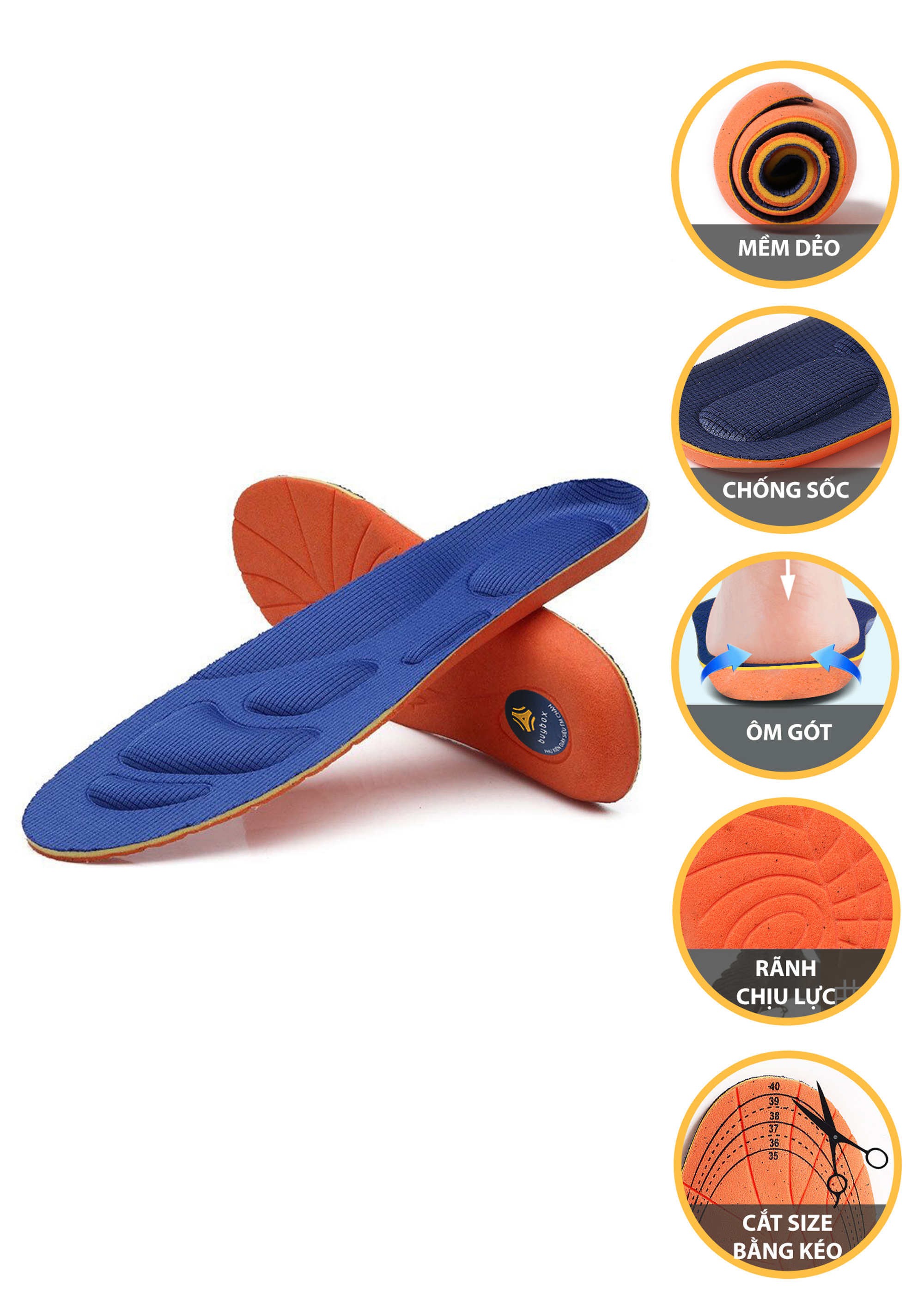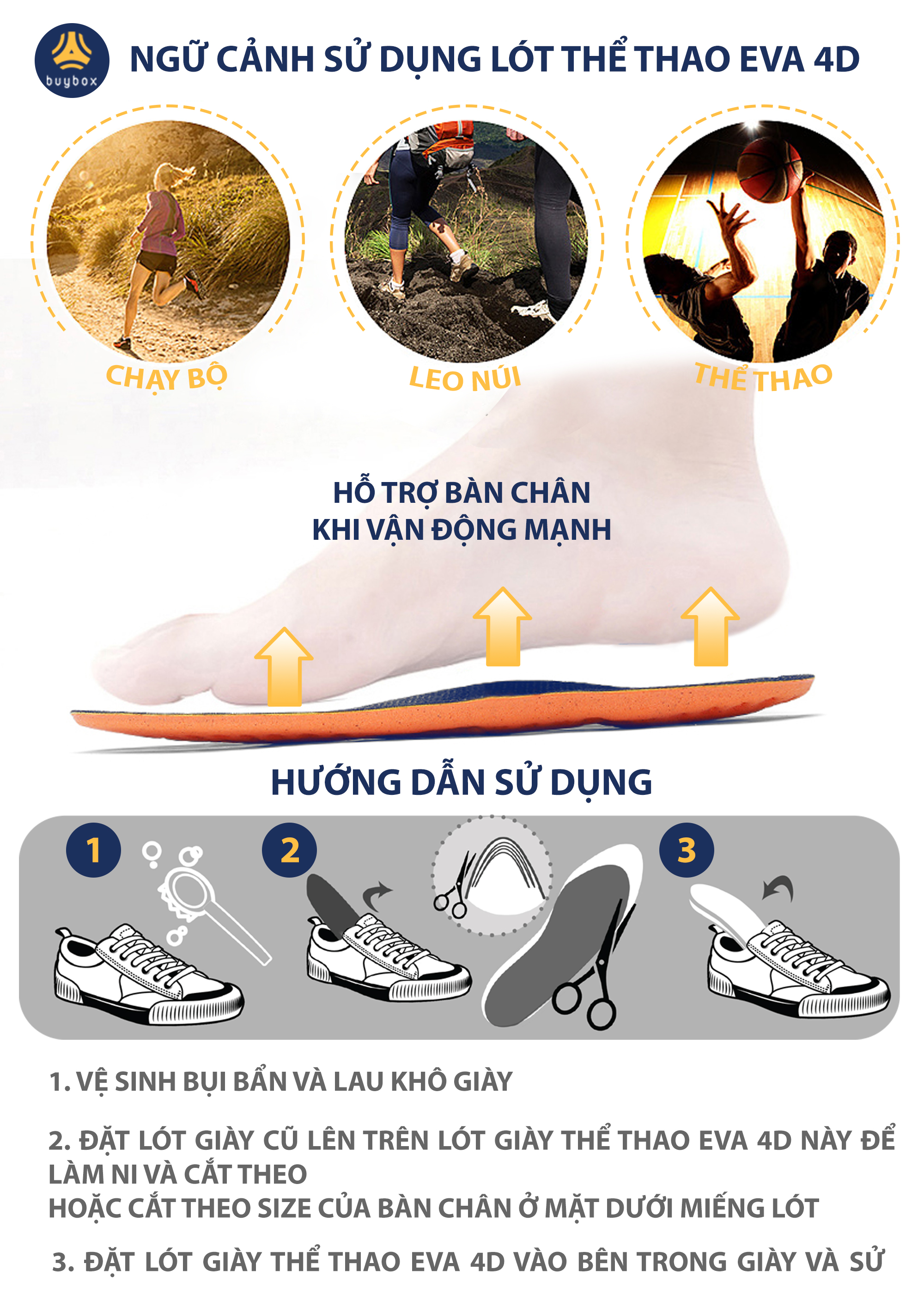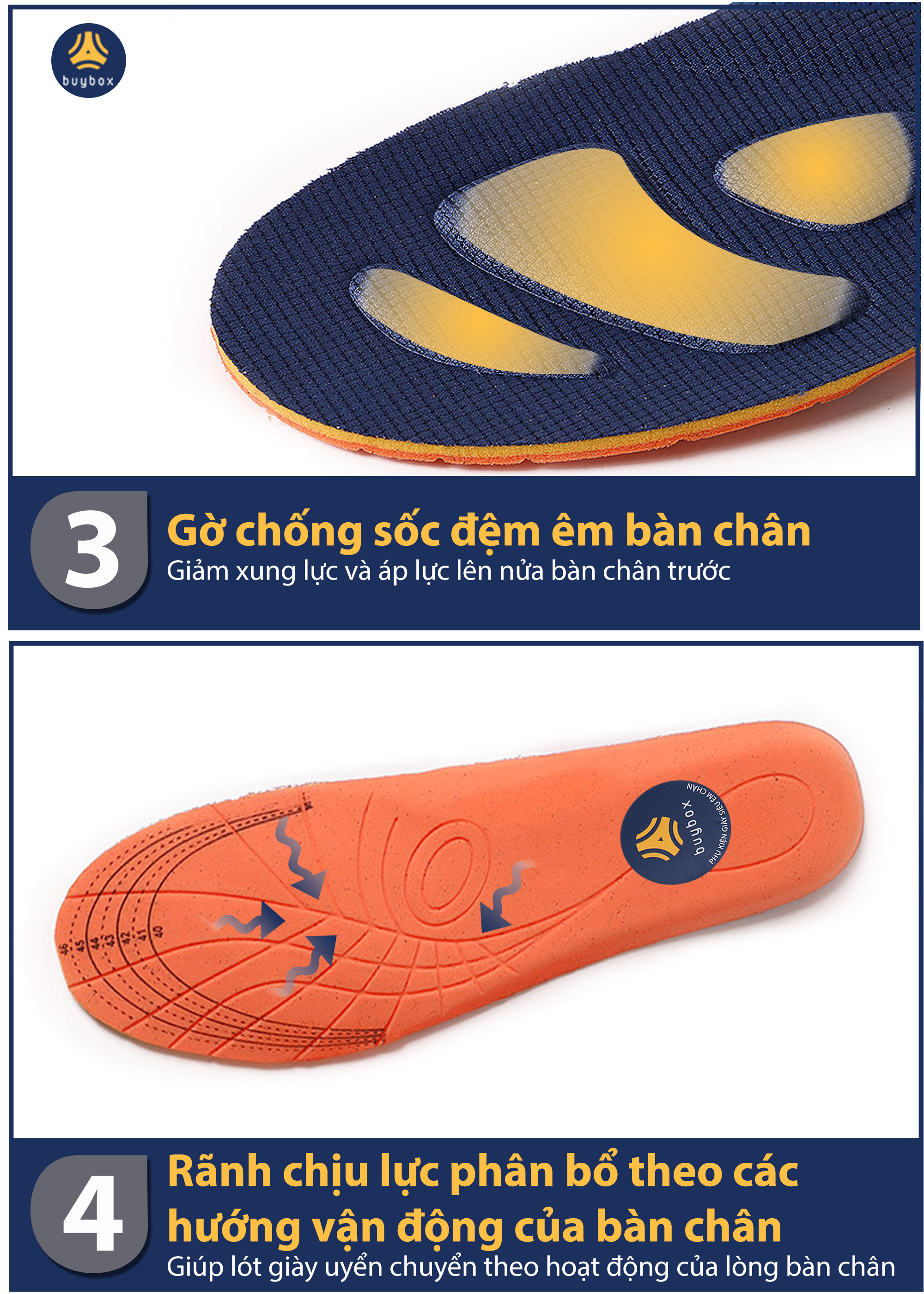 Sử dụng Lót giày thể thao EVA với 6 gờ chống sốc và rãnh chịu lực của buybox đệm êm bàn chân, giảm tổn thương lên chân.