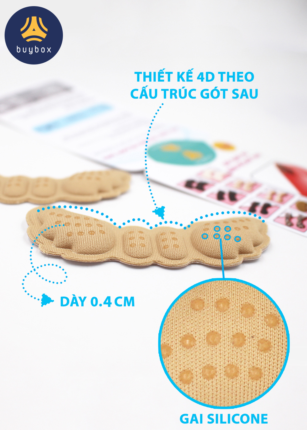 Giày cao gót thật quyến rũ và cũng thật "Đau Đớn" đối với đôi bàn chân. Không ít trường hợp bị trầy da chảy máu, chai sần da gót sau, thậm chí để lại sẹo. Từ nay không còn phải lo lắng nữa vì đã có "Lót gót giày 4D hình cánh bướm có mặt gai silicone chống trầy rách da và chống tuột gót chân" của buybox. CÔNG DỤNG NỔI BẬT