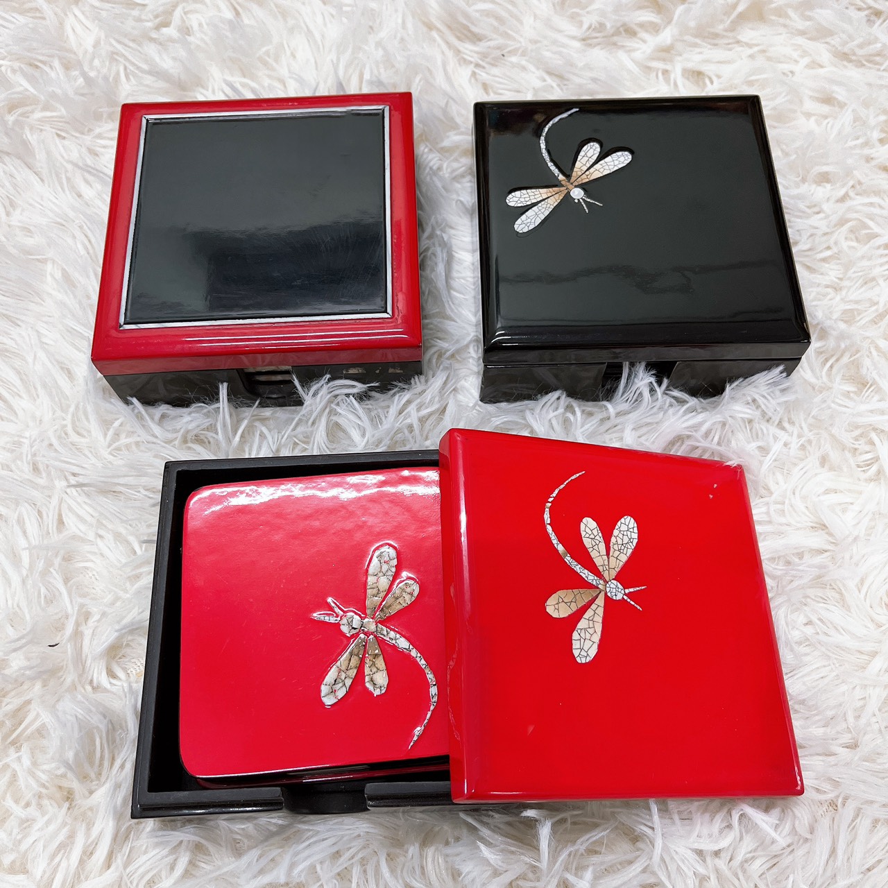 Hộp lót ly có phong nền đỏ,bên trên được khảm trứng hình con chuồn chuồn,làm cho hộp lót ly thêm phần đẹp mắt
