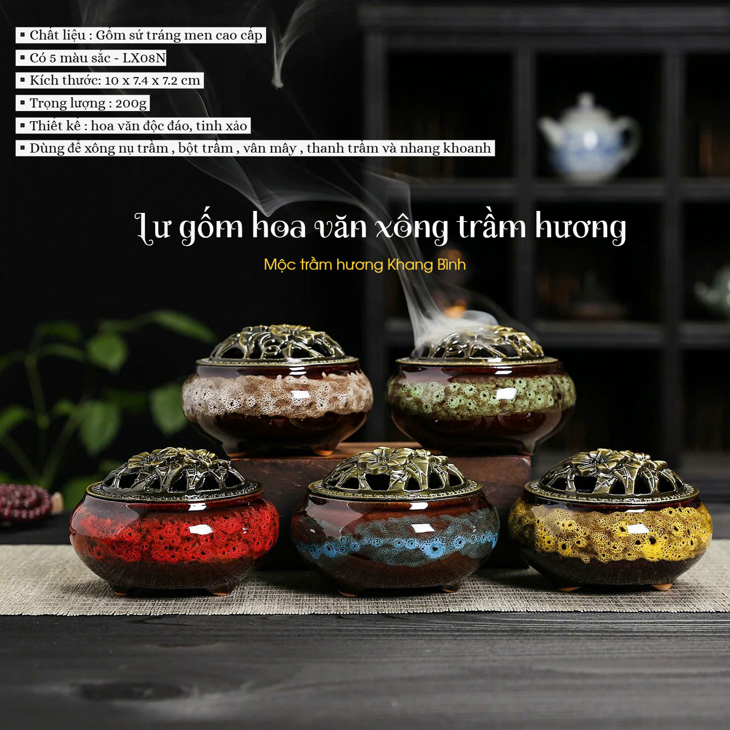 Lư gốm sứ Hoa Văn Xông đốt nụ vân mây nhang Trầm Hương kèm đế lót bông - Mộc Trầm Hương Khang Bình ️ Chất liệu : Gốm sứ tráng men cao cấp ️ Có 5 màu sắc - LX08N ️ Kích thước: 10 x 7.4 x 7.2 cm ️ Trọng lượng : 200g ️ Thiết kế : hoa văn độc đáo, tinh xảo ️ Dùng để xông nụ trầm , bột trầm , vân mây , thanh trầm và nhang khoanh ️ Sản phẩm chỉ duy nhất gồm 1 Lư gốm sứ ( không bao gồm trầm ) ️ Lư hương được làm bằng gốm sứ tráng men. Có hai loại là men chảy và men rạn được chế tác thủ công rất đẹp như hình. ️ Lư hương là nơi để đốt trầm, nhang, chủ yếu để tạo ra mùi hương thơm, bởi theo quan niệm từ xưa thì hương thơm thể hiện lòng thành, sự thanh khiết cao quý. ️ Chính vì thế, lư hương với những khói trầm toả ra có tác dụng thanh lọc khí rất tốt , về mặt tâm linh thì nó hoá giải được hung khí tăng thêm cát khí, gia tăng sự hoà thuận, hiếu thảo, sự tăng tiến về trí tuệ tài lộc. ️ Phù hợp cho các hoạt động thiền định, tĩnh tâm hoặc trang trí không gian phong thủy , góc làm việc của bạn ️ Hướng dẫn sử dụng: