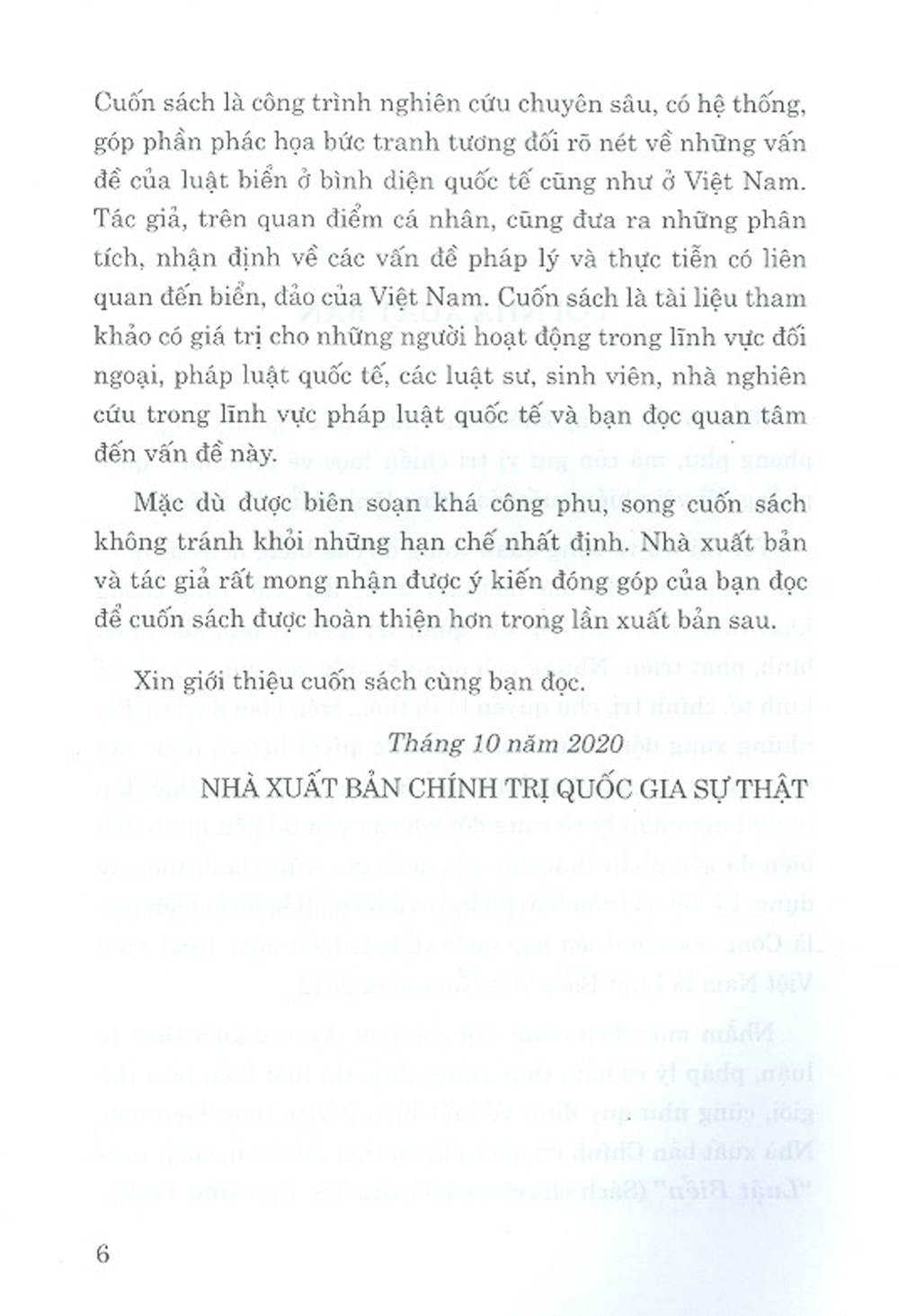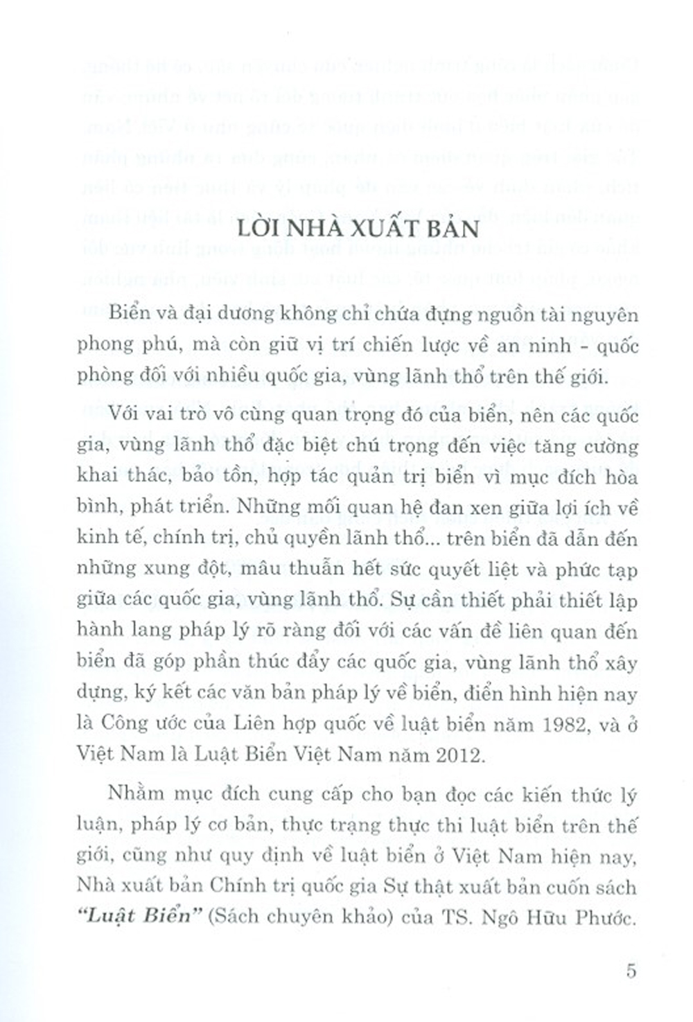 Nhằm mục đích cung cấp cho bạn đọc các kiến thức lý luận, pháp lý cơ bản, thực trạng thực thi luật biển trên thế giới, cũng như quy định về luật biển ở Việt Nam hiện nay, Nhà xuất bản Chính trị quốc gia Sự thật xuất bản cuốn sách “Luật Biển” (Sách chuyên khảo) của TS. Ngô Hữu Phước. Cuốn sách là công trình nghiên cứu chuyên sâu, có hệ thống, góp phần phác họa bức tranh tương đối rõ nét về những vấn đề của luật biển ở bình diện quốc tế cũng như ở Việt Nam. Tác giả, trên quan điểm cá nhân, cũng đưa ra những phân tích, nhận định về các vấn đề pháp lý và thực tiễn có liên quan đến biển, đảo của Việt Nam. Cuốn sách là tài liệu tham khảo có giá trị cho những người hoạt động trong lĩnh vực đối ngoại, pháp luật quốc tế, các luật sư, sinh viên, nhà nghiên cứu trong lĩnh vực pháp luật quốc tế và bạn đọc quan tâm đến vấn đề này.