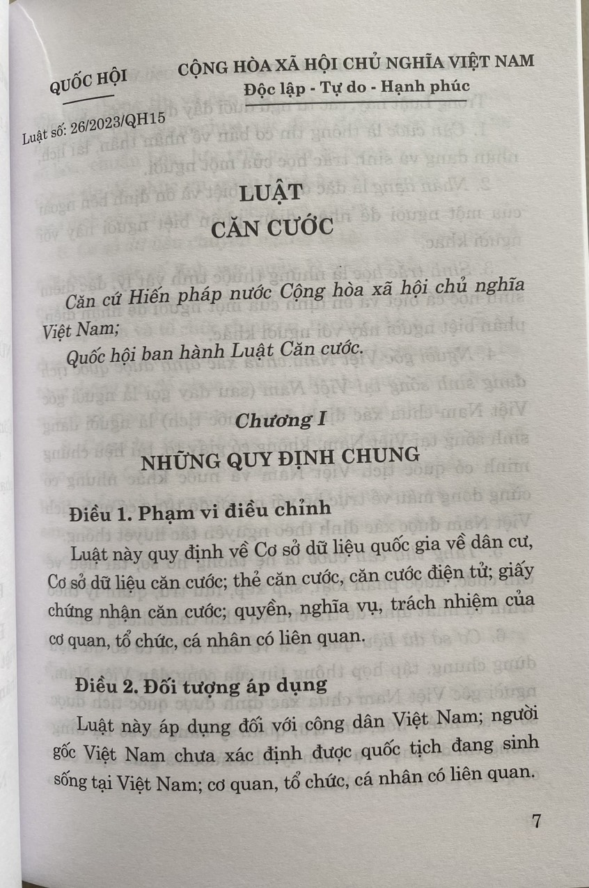 Mua tại TiktokLUẬT CĂN CƯỚC ( Theo Luật số 26/2023/QH15 áp dụng từ ngày 01-07-2024) Luật này quy định về Cơ sở dữ liệu quốc gia về dân cư, Cơ sở dữ liệu căn cước; thẻ căn cước, căn cước điện tử; giấy chứng nhận căn cước; quyền, nghĩa vụ, trách nhiệm của cơ quan, tổ chức, cá nhân có liên quan.