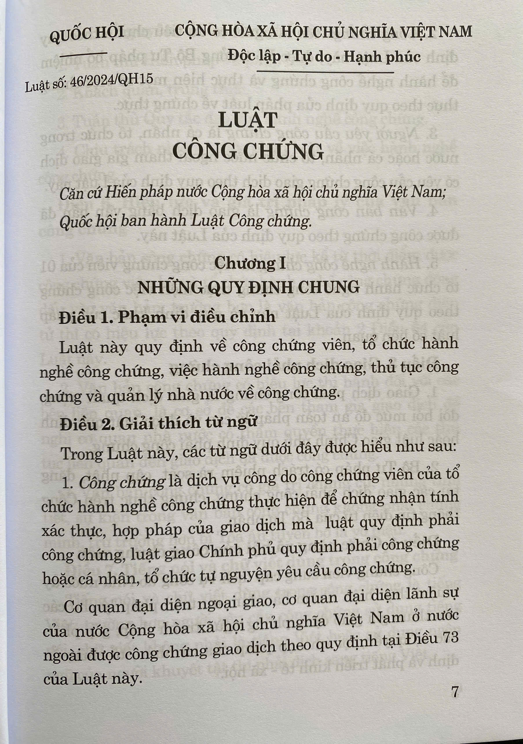 Luật Công Chứng số 46/2024/QH15 đã được Quốc Hội khoá XV, kỳ họp thứ 8 thông qua ngày 26 tháng 11 năm 2024. Luật gồm có 8 chương, 76 điều. Luật này có hiệu lực thi hành từ ngày 01 tháng 07 năm 2025