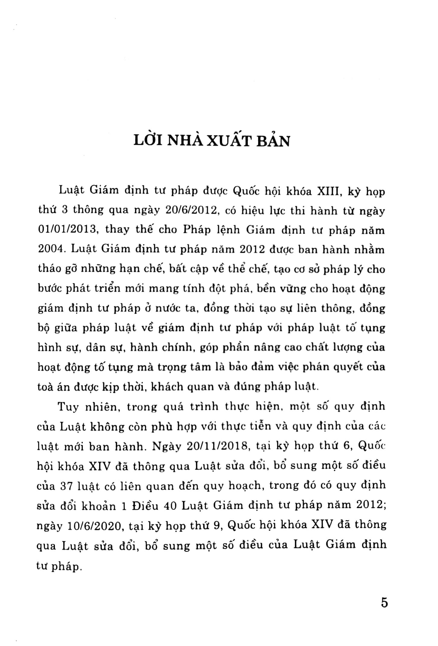 Tuy nhiên, trong quá trình thực hiện, một số quy định của Luật không còn phù hợp với thực tiễn và quy định của các luật mới ban hành. Ngày 20/11/2018, tại kỳ họp thứ 6, Quốc hội khóa XIV đã thông qua Luật sửa đổi, bổ sung một số điều của 37 luật có liên quan đến quy hoạch, trong đó có quy định sửa đổi khoản 1 Điều 40 Luật Giám định tư pháp năm 2012; ngày 10/6/2020, tại kỳ họp thứ 9, Quốc hội khóa XIV đã thông qua Luật sửa đổi, bổ sung một số điều của Luật Giám định tư pháp.