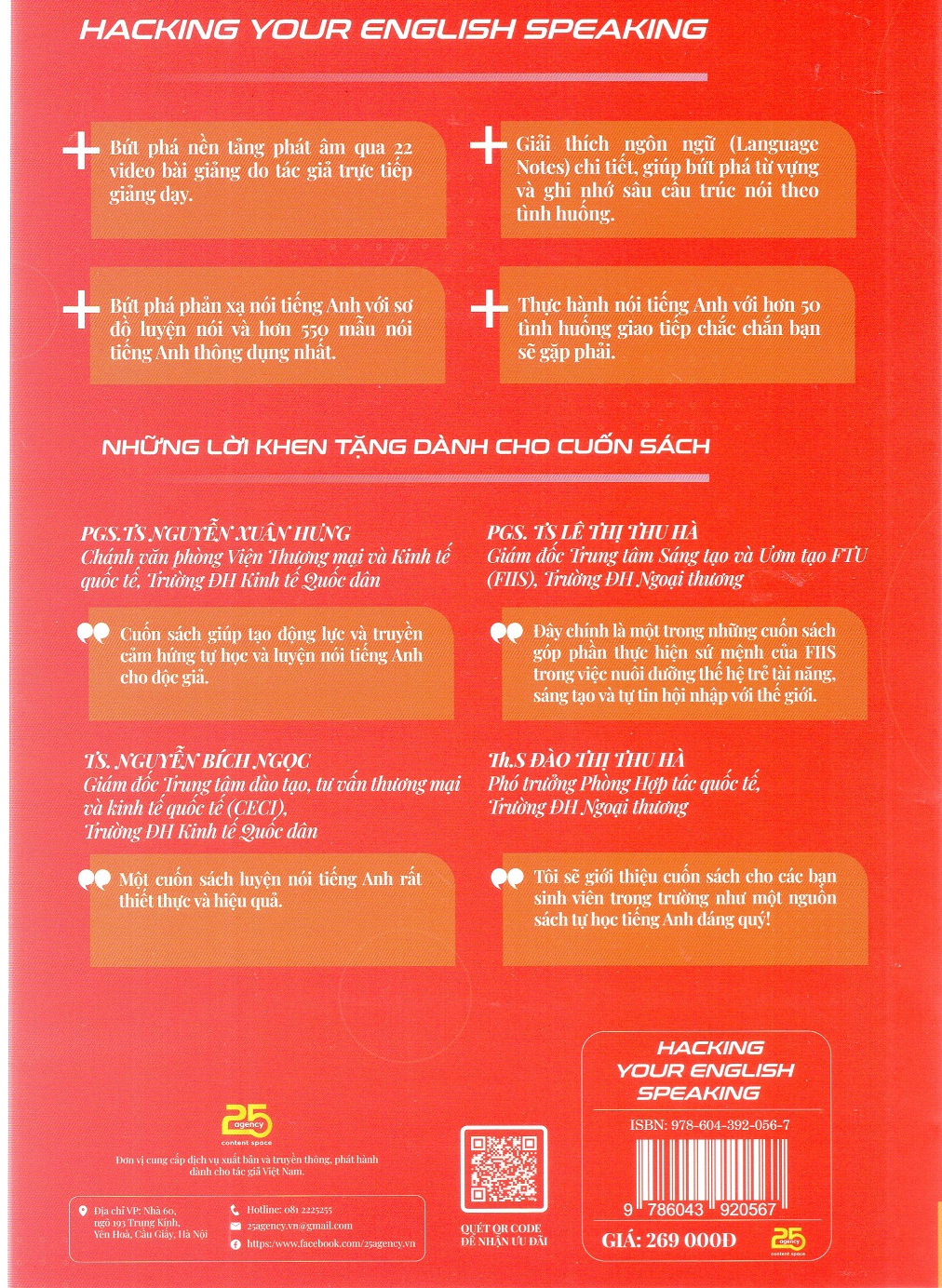 Chương 1: Động lực học tiếng Anh Chương 2: IPA Chart (International Phonetic Alphabet) – Bảng ký tự phiên âm Quốc tế Chương 3: Stop thinking, Start Speaking. Học và sử dụng ngay các từ, cụm từ và cấu trúc câu thông dụng trong tiếng Anh nói. Luyện nói phản xạ tự động sử dụng sơ đồ tư duy sinh động và các câu minh họa đơn giản. Qua Chương 3, bạn sẽ học được tối thiểu 50 cấu trúc nói (speaking pattern) thông dụng, 500 từ và cụm từ tiếng Anh giao tiếp hay gặp nhất. Chương 4: Real English. 50 hội thoại tiếng Anh thông dụng nhất qua 4 bước thực hành sẽ giúp bạn phản xạ nói tiếng Anh được trong hầu hết các tình huống giao tiếp thông dụng. Bằng phương pháp ghi nhớ từ vựng qua ngữ cảnh, nghe nói phản xạ qua nghe audio và sử dụng sơ đồ hội thoại, nghe và bắt chước, cùng các language notes chi tiết, bạn sẽ có thể giao tiếp được trong hầu hết mọi tình huống thông dụng nhất. Chương 4 sẽ có audio đi kèm để sử dụng cho việc luyện nghe nói phản xạ.