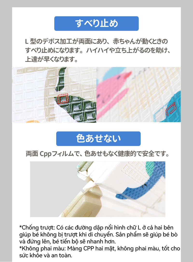Thảm xốp cho bé Umoo Gấp gọn, thảm lót cho bé chơi Tính năng vượt trội của thảm gấp 2 mặt cao cấp + Chất liệu xốp XPE, 2 mặt silicon không mùi. An toàn