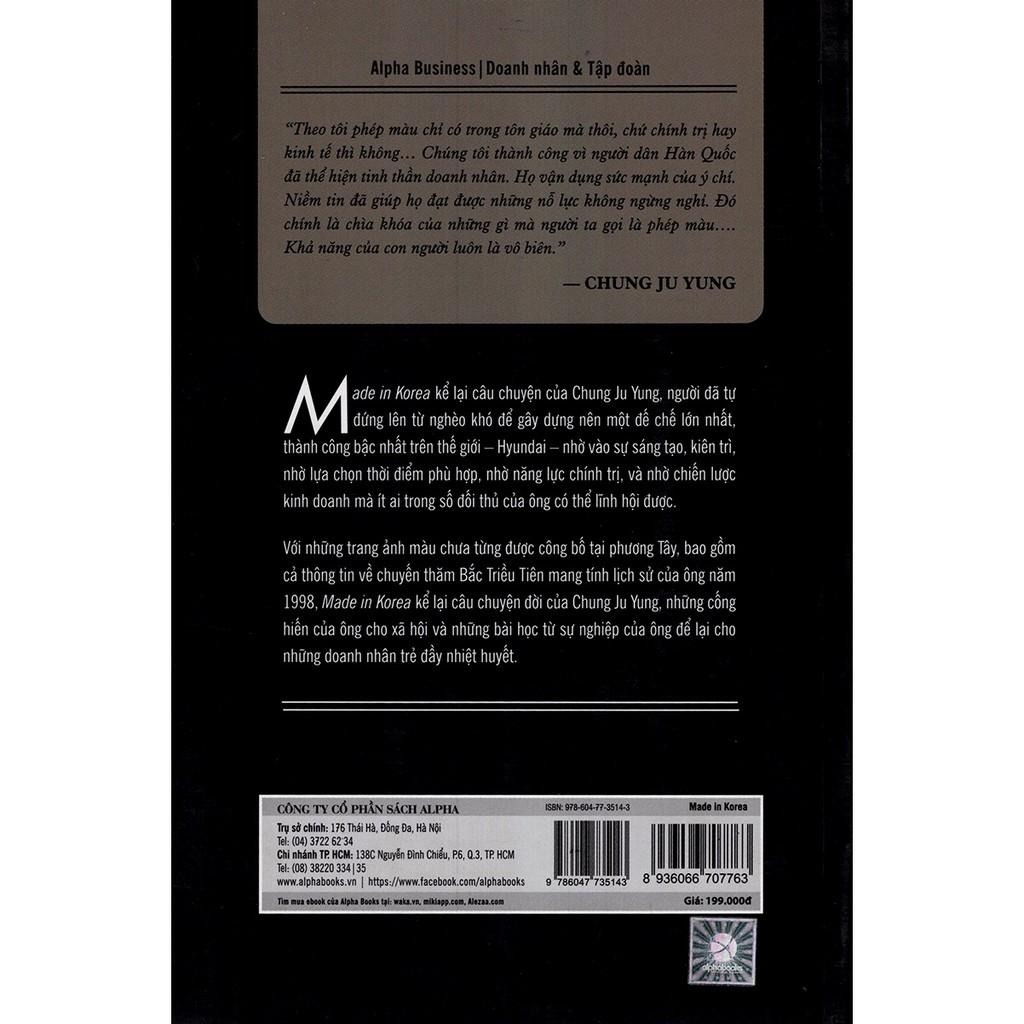 Với những trang ảnh màu chưa từng được công bố tại phương Tây, bao gồm cả thông tin về chuyến thăm Bắc Triều Tiên mang tính lịch sử của ông năm 1998, Made in Korea kể lại câu chuyện đời của Chung Ju Yung, những cống hiến của ông cho xã hội và những bài học từ sự nghiệp của ông để lại cho những doanh nhân trẻ đầy nhiệt huyết.