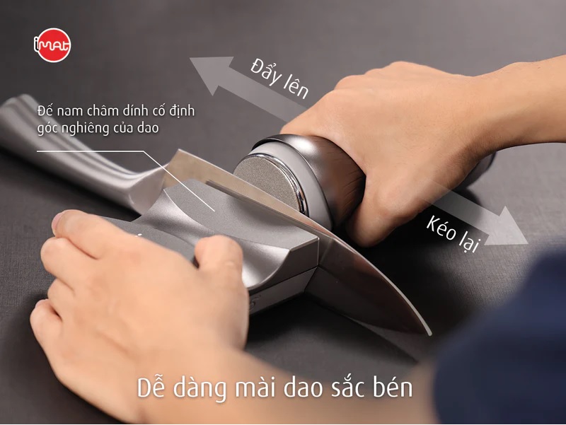 Bộ dụng cụ mài dao trục lăn được thiết kế với các góc mài phù hợp với từng loại dao. Sử dụng nam châm cực mạnh để hút chặt dao và cố định góc mài, người dùng chỉ cần đẩy trục mài đi lại để bánh xe mài lưỡi dao đúng góc, giúp dao trở nên cực kỳ sắc bén.