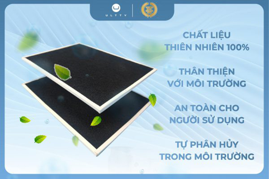 Màng lọc than carbon hoạt tính chuyên dụng cho máy hút ẩm Ultty được sản xuất từ những vật liệu thuần thiên nhiên 100%. Lớp phủ bột carbon hoạt tính được sản xuất từ than carbon của gáo dừa, loại vật liệu cho ra chất lượng carbon hoạt tính có độ hút mùi tốt . Lớp carbon hoạt tính này được phủ trên những sợi sơ dừa được xử lý và định hình trên khung giấy cứng, giúp đảm bảo độ cứng vững đồng thời định hình tốt hình dáng thiết kế của sản phẩm.