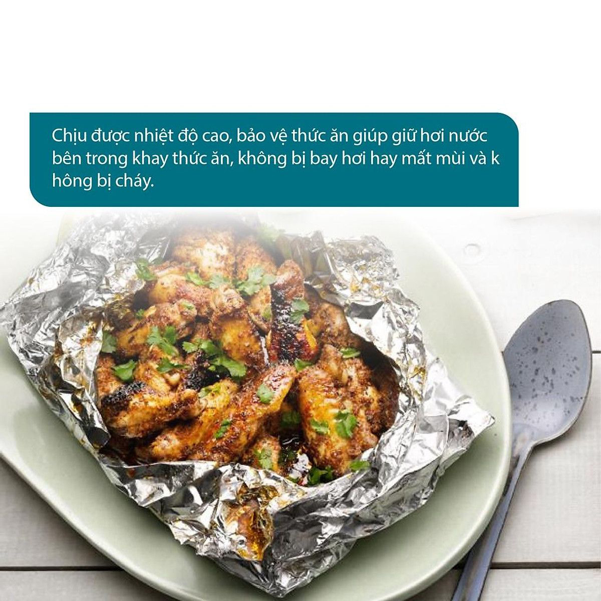 • Màng nhôm bọc thực phẩm chịu được nhiệt độ cao, bảo vệ thức ăn giúp giữ hơi nước bên trong khay thức ăn, không bị bay hơi hay mất mùi và không bị cháy.