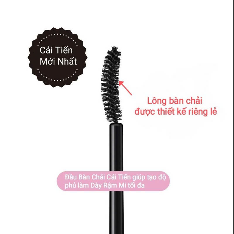 Mascara có chất mực được chiết xuất từ Nhân sân Panax , Sữa ong chúa , Hoa trà, Nụ tầm xuân , “SỢI POLYMER EX LÀM DÀI “ , thành phần “ KHOÁ GIỮ NẾP CONG” tạo phồng rậm làn mi, giúp từng sợi mi được dày rậm, nâng cong làn mi và ngay lập tức giúp Khóa giữ Nếp Cong cả ngày . Ngoài ra còn cung cấp dưỡng chất dưỡng làn mi , tránh tình trạng cay mắt, rụng mi , nhăn vùng mí mắt khi sử dụng . Đặc biệt Đầu chải Mascara siêu mịn giúp chống cọ sát, gây khó chịu khi sử dụng . Tuy độ bám siêu bền , không trôi nhưng lại dễ dàng rửa sạch bằng nước ấm ( 35-38 Độ )