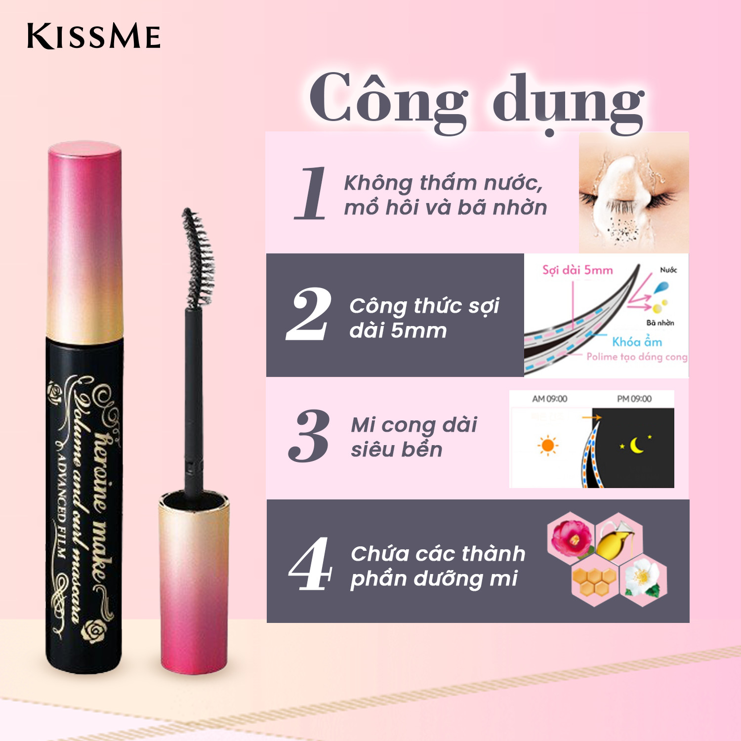 Mascara Màng Film Chống Trôi, Chải Tơi Và Dày Rậm Làn Mi Mỏng Kissme Heroine Make (Mini) Thương hiệu: Kissme Xuất xứ: Nhật Bản Khối lượng tịnh: 1.8g HSD: 5 năm kể từ ngày