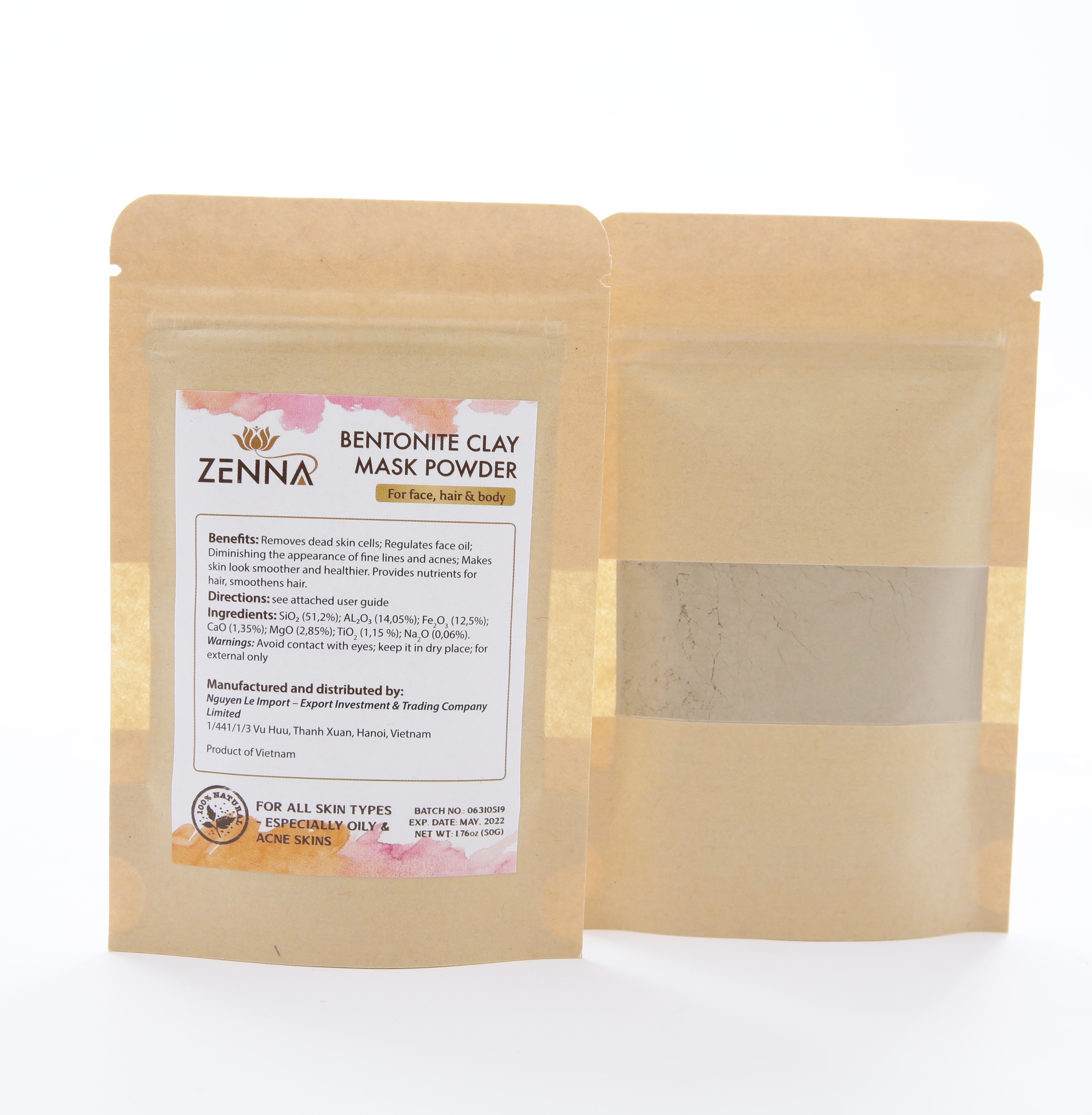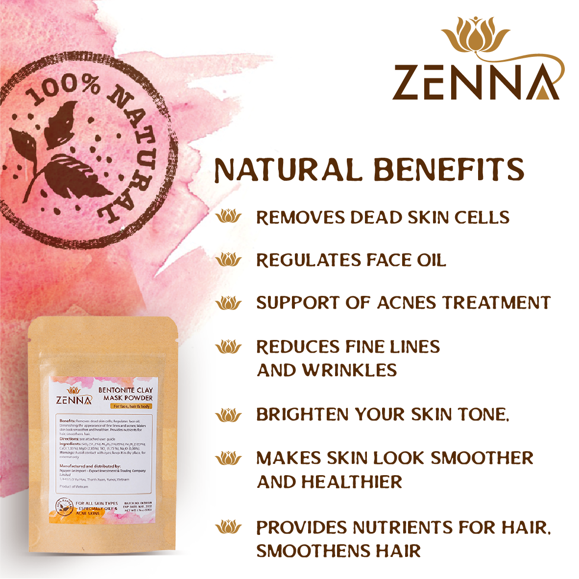 - Chất lượng sản phẩm đạt tiêu chuẩn quốc tế: Được khai thác từ vùng mỏ Bentonite Clay trầm tích, Mặt nạ bùn khoáng núi lửa ZENNA được tìm thấy chứa nhiều loại vi khoáng thiết yếu có lợi, giúp tái tạo hệ thống phòng vệ cho da, giúp da sạch, sáng và khỏe dần từ sâu bên trong. Để được lưu hành sản phẩm trên thị trường, bùn khoáng ZENNA đã trải qua các quá trình kiểm duyệt khắt khe về tiêu chuẩn chất lượng của Sở Y tế, được xử lý khai thác tại nhà máy chuẩn GMP và được đóng gói trong môi trường khép kín theo quy trình đạt chuẩn ASEAN. Bùn khoáng ZENNA được công nhận là sản phẩm đạt tiêu chuẩn về hàm lượng khoáng Bentonite kiềm, nguyên chất 100%. Trong Bentonite kiềm chứa các thành phần chủ yếu là Canxi, Magie, Natri, Silic… kèm một số khoáng chất vi lượng rất cần thiết cho cơ thể con người và không chứa thành phần độc hại nào. Hiện sản phẩm đã có mặt trên trang TMĐT lớn nhất - Amazon, đã sẵn sàng để mang sản phẩm Việt Nam chất lượng cao vươn ra toàn cầu.