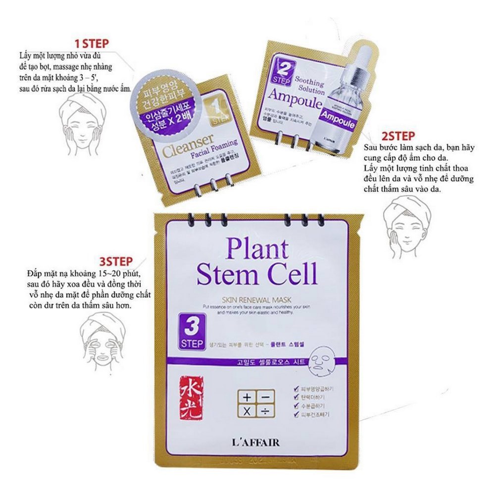 - Mặt nạ gồm 3 bước: Sữa rửa mặt tạo bọt giúp loại bỏ các chất thải trên da và mang lại hiệu quả dinh dưỡng và làm dịu cho làn da nhạy cảm với một ống chứa một viên nang vitamin. Tấm nâng S cao cấp được làm từ mô sợi nano tự nhiên và có độ đàn hồi tuyệt vời để mang lại hiệu quả nâng cho da. Đối tượng sử dụng: Mặt Nạ Dưỡng Da Rainbow L'Affair Plant Stem Cell Skin Renewal 25ml phù hợp với mọi loại da. Hướng dẫn sử dụng: