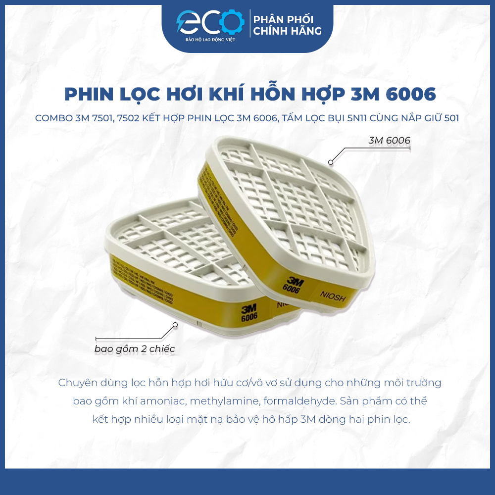 Phin lọc 3M dòng 6000 (gồm các mã 6001, 6003, 6006) kết hợp với tấm lọc bụi 5N11 và nắp giữ 501 là giải pháp bảo vệ hô hấp hiệu quả trong môi trường có