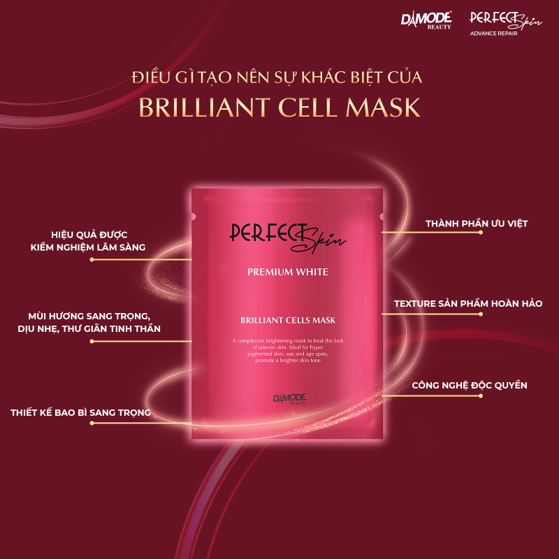 Mask Brilliant Cell, Mặt Nạ Tinh Chất Dưỡng Trắng Da, Mờ Thâm, Sạm một sản phẩm thuộc dòng Perfect skin Xuất xứ: Hàn Quốc  Mô tả: Trắng da, thải độc, giảm vết thâm, sạm, cân