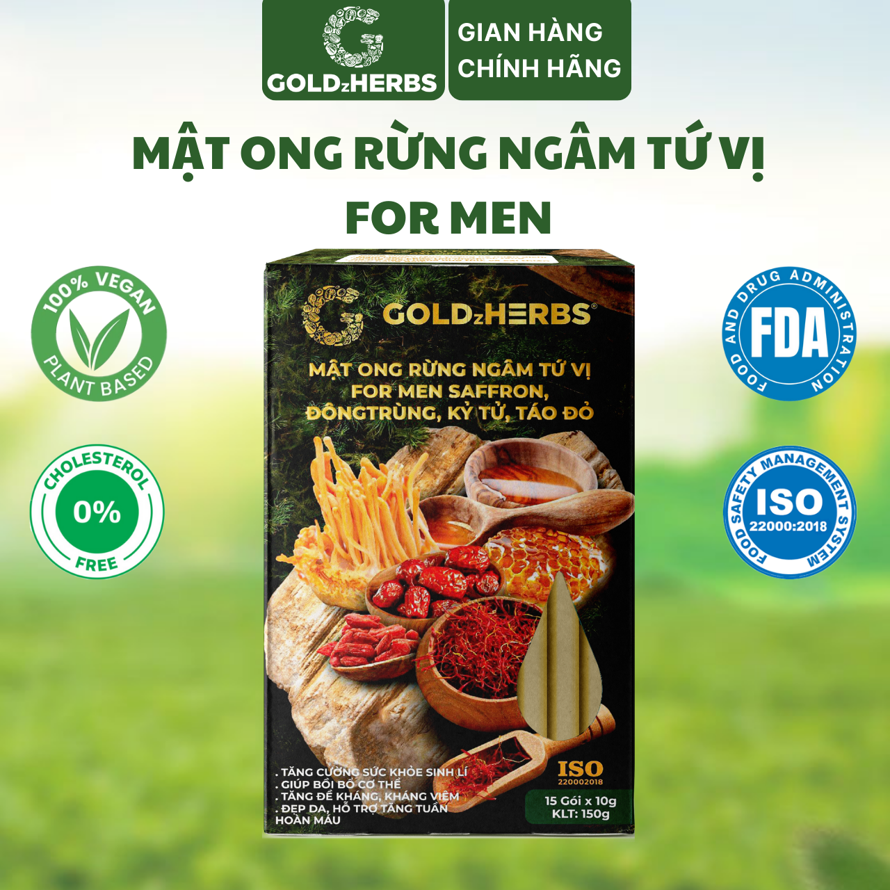 Mật ong rừng ngâm tứ vị For Men GoldzHerbs Sự kết hợp của các thành phần như saffron, đông trùng hạ thảo, kỷ tử, táo đỏ ngâm đẫm trong mật ong nguyên chất tạo nên