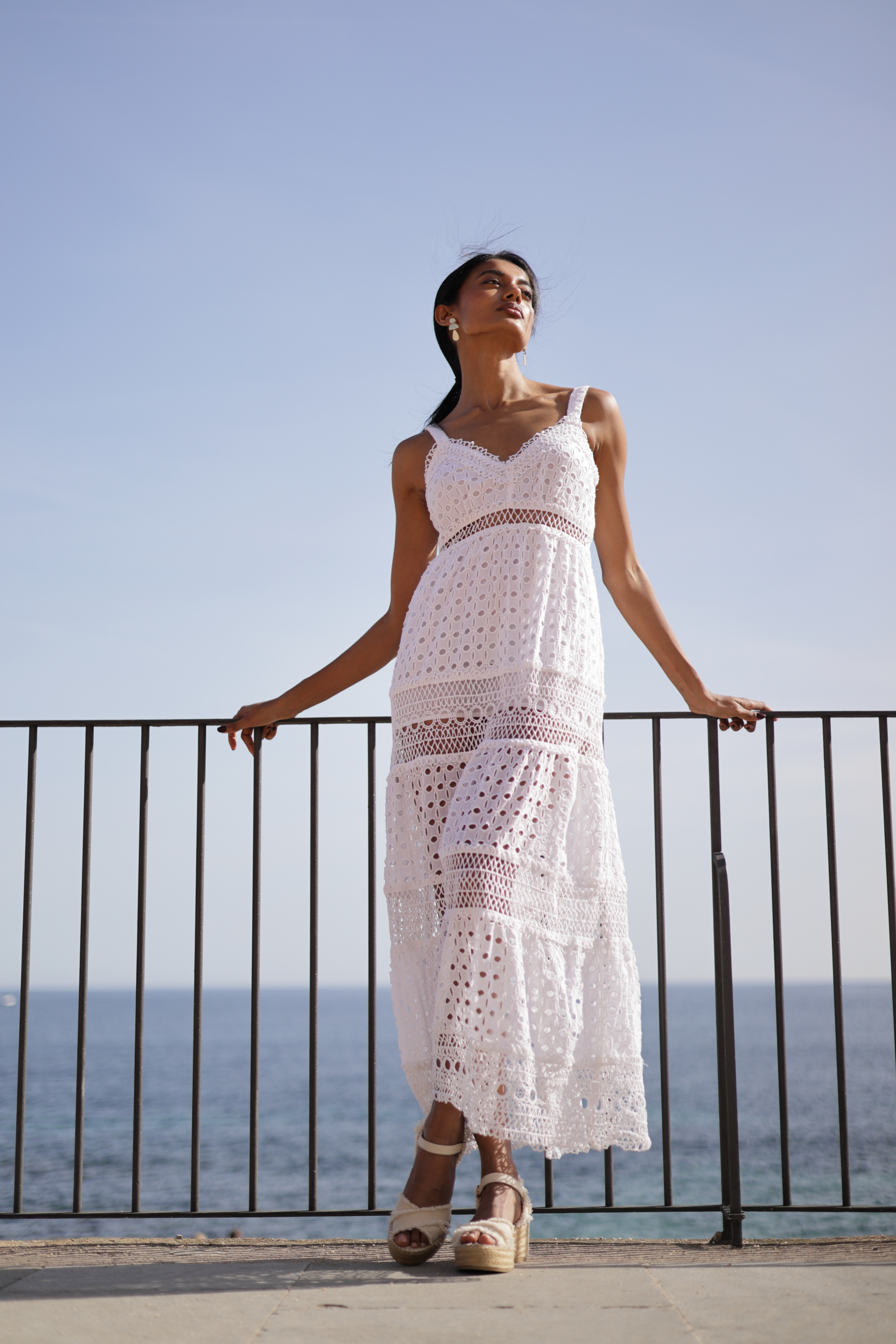 Maxi 2 Dây Phối Ren Isla Bonita, chất liệu cotton mềm mại, nổi bật phần ren phối trước ngực. Phom suông. Dài đầm 120cm (40x120cm) Phù hợp đi biển, dạo phố, công sở, hoặc dự
