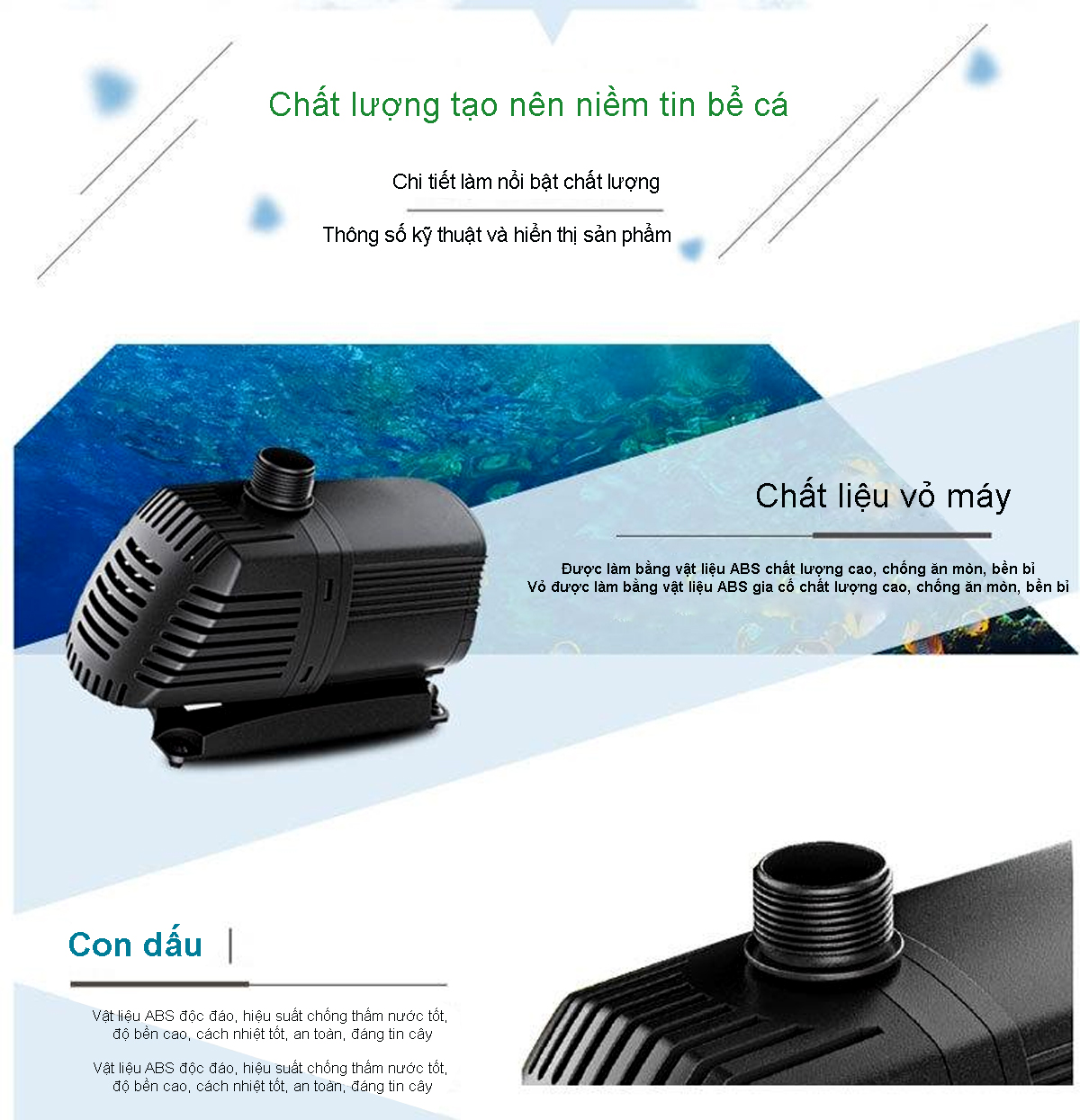 - Sử dụng trục gốm có thể được sử dụng trong nước ngọt và nước biển. - Động cơ được phủ nhựa, và tính năng chống thấm nước và cách ly tuyệt đối - Thiết