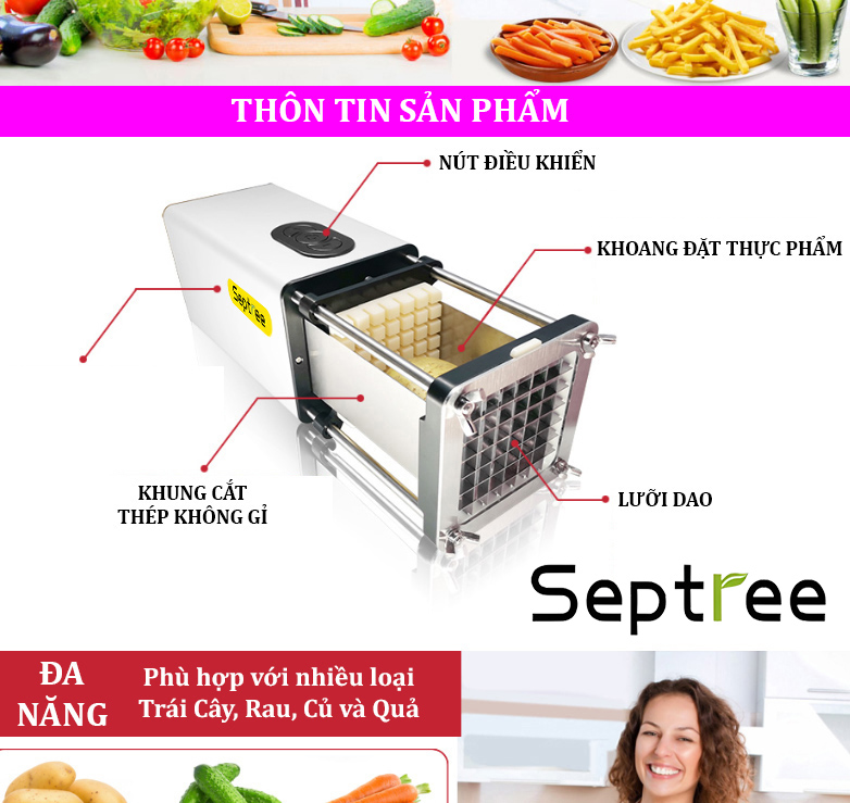 Máy cắt rau củ quả đa năng thương hiệu Mỹ Septree SL-12 Máy cắt khoai tây chiên đa năng và các loại củ, quả. Thương hiệu Mỹ mang phong cách kiểu dáng Pháp