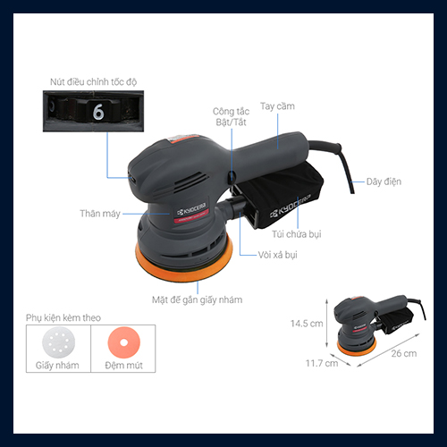 Máy chà nhám hiệu Kyocera với công suất 300W và tốc độ không tải lên đến 12000 vòng/phút sẽ là người bạn đồng hành hoàn hảo để hoàn thành công việc của bạn một cách nhanh chóng.