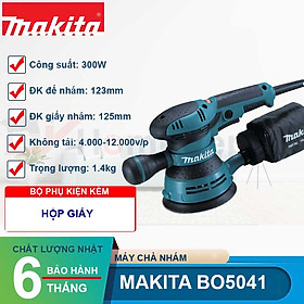 Công suất 300 W Đường kính đế nhám 123 mm Đường kính dấy giám 125 mm Vòng quay 4,000 - 12,000 vòng/phút Kích thước 218 x 123 x 153 mm Trọng lượng 1.4 kg Dây dẫn điện 2.0 m Máy chà nhám quỹ đạo 125mm Makita BO5041 là một sản phẩm chất lượng cao của thương hiệu Makita, một thương hiệu hàng đầu Nhật Bản. Hiện nay, Makita cũng là một trong những nhà sản xuất hàng đầu thế giới về uy tín, được sản xuất theo một quy trình nghiêm ngặt và chất lượng tại Nhật Bản, đem lại khả năng hoạt động bền bỉ, mạnh mẽ, an toàn, cùng năng suất làm việc cao.