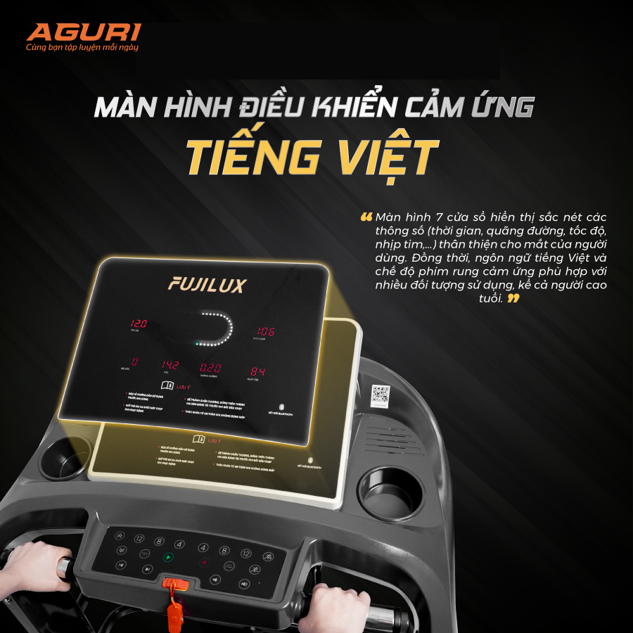 Máy chạy bộ AGURI AGT-127LE - máy chạy bộ tại nhà Đây là máy chạy bộ chính hãng của thương hiệu AGURI - Máy tập của Cầu thủ Công Phượng. Là mẫu máy chạy bộ giá tốt được nhiều người tiêu dùng lựa chọn. Một mẫu máy chạy bộ gấp gọn dễ dàng, tiết kiệm không gian cho người dùng. > THÔNG SỐ KỸ THUẬT: - Motor DC công suất 3.5HP - Tốc độ: 1.0km/h – 16km/h - Chương trình mặc định: P1-P24 - Kích thước đặt máy (dài-rộng-cao): 1760*720*1320mm - Kích thước đóng thùng: 1780*760*325mm - Diện tích băng tải: 450*1350mm - Trọng lượng người dùng tối đa: 130 kgs - N.W/G.W: 80/90kg > MÔ TẢ SẢN PHẨM: - Màn hình LED 5 cửa số hiển thị: thời gian, quãng đường, vận tốc, nhịp tim, calories, chương trình mặc định - Máy có piston thủy lực nâng đỡ, có thể gập gọn máy khi không sử dụng, bàn chạy có tay cầm để dễ dàng nhấc bàn chạy lên - Máy có bánh xe di chuyển rất dễ dàng - Máy được trang bị 1 đầu massage, đánh mỡ bụng ; bộ phận gập bụng - Có hệ thống giảm sóc khi hoạt động, kết nối Bluetooth, hệ thống 2 loa stereo - Có chức năng đo chỉ số cơ thể (Body fat) > CHÍNH SÁCH BẢO HÀNH, BẢO TRÌ: - Bảo hành chi tiết máy lên tới 5 năm. Cụ thể:
