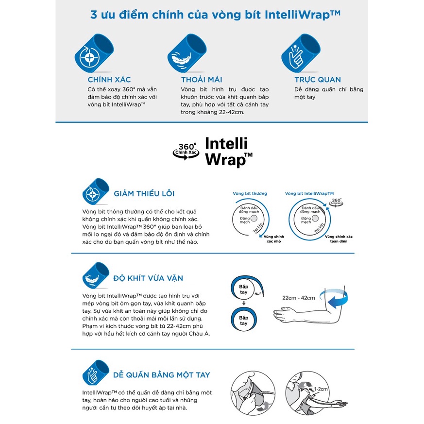 Tính năng nổi bật - Công nghệ Intellisensemới, tự động hoàn toàn. - Có chỉ dẫn quấn vòng bít đúng. - Báo nhịp tim bất thường - Biểu tượng huyết áp