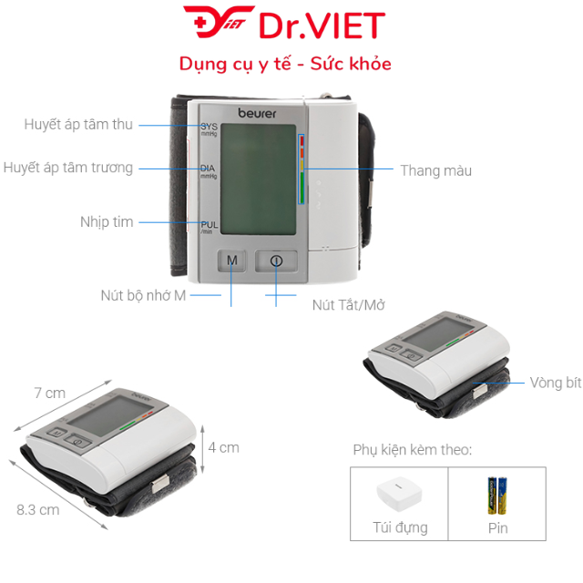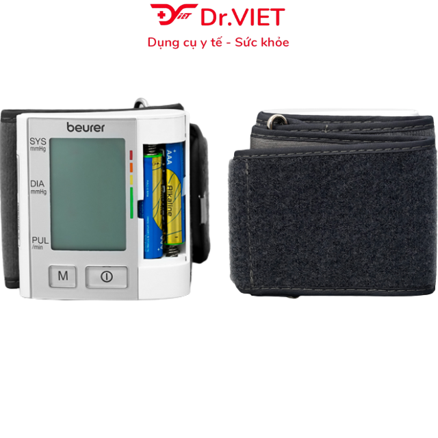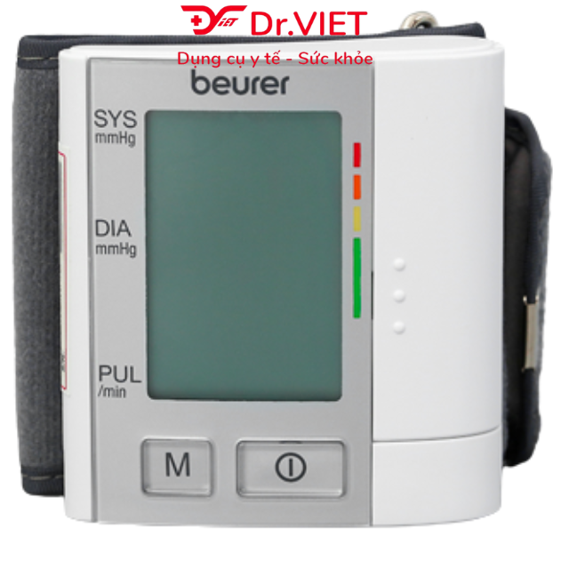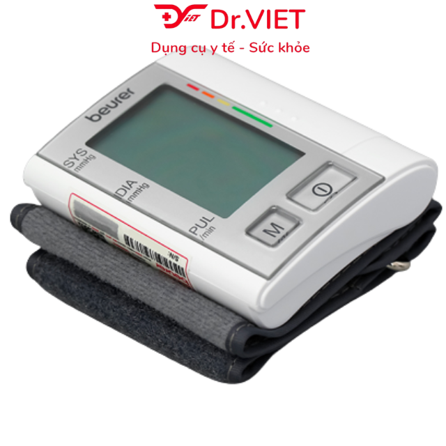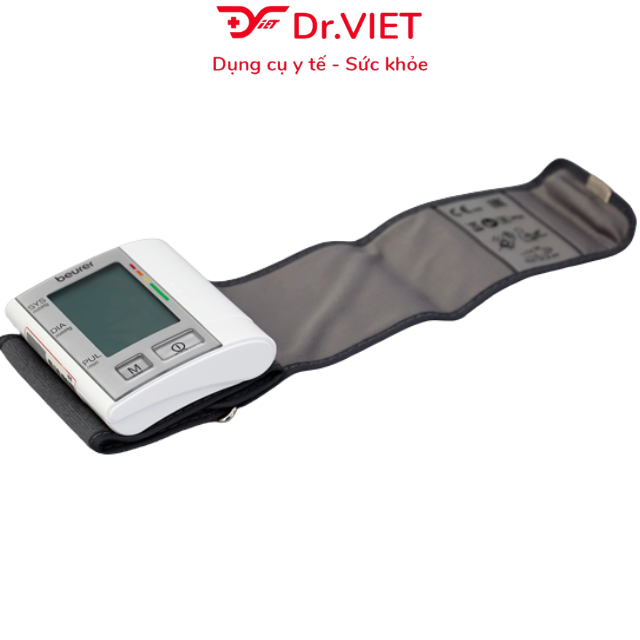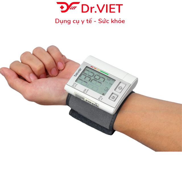• Tư thế đo :      + Giữ cơ thể trong trạng thái nghỉ ngơi trong 5 phút.      + Tư thế ngồi thoải mái, dựa lưng vào ghế, không bắt chéo chân, đặt cả hai bàn chân lên mặt đất. Đặt vòng bít           ngang với tim (nếu không sẽ gây ra sai lệch). Để bàn tay thư giãn,không nắm chặt. Không nói chuyện trong quá           trình đo. -Thao tác đo:      + Nhấn vào biểu tượng mở/tắt để khởi động máy.      + Màn hình sẽ sáng và tự động đo sau 3 giây.      + Sau vài giây kết quả sẽ được hiển thị lên màn hình ( Biểu tượng báo lỗi sẽ hiển thị nếu quá trình đo xảy ra lỗi). Thông số kỹ thuật: -Thương hiệu: Beurer - Đức -Phương pháp đo: Đo huyết áp dao động  -Mã sản phẩm: BC40 -Pin AAA 2 x 1.5 V, tín hiệu báo thay pin. -Tiêu chuẩn công nghệ: Châu Âu. -Kích thước (DxRxC): 76 x 70 x 23 mm. -Trọng lượng: Khoảng 105 g (không pin, có vòng bít) -Điện thế pin: 3V. -Vòng đời pin: Dùng trong khoảng 300 lần đo, phụ thuộc vào huyết áp, áp suất bơm. -Bộ nhớ: 1 x 60 kết quả -Chu vi vòng bít: 13,5 - 19,5cm. -Tự động tắt máy khi không sử dụng. -Tín hiệu báo thao tác sai. -Bảo hành 36 tháng   LƯU Ý -Không nên đo sau khi bạn vừa ăn uống, hút thuốc hoặc tập thể dục. -Nên lặp lại việc đo sẽ cho bạn giá trị đo chính xác nhất. -Không đo ở trên cổ tay có vết thương.