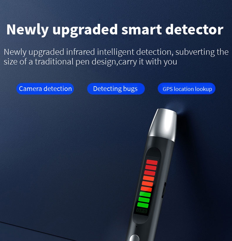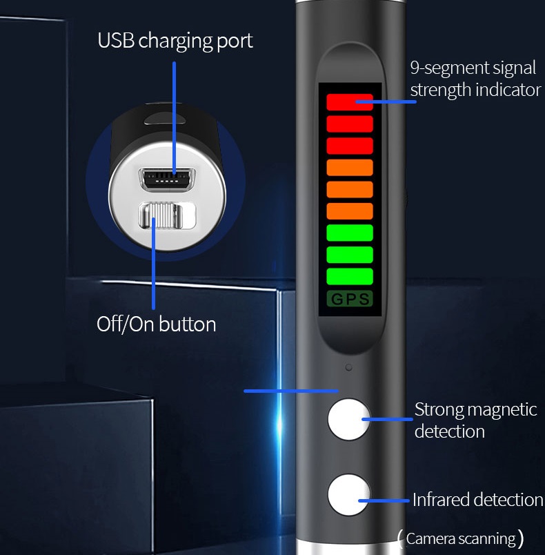 Mô Tả sản phẩm: Tên sản phẩm: Chất liệu: ABS Kích thước: 102x52x21mm Công suất: 3.7V/300mA pin lithium Phạm Vi phát hiện: 1MHZ-6000MHZ Phát Hiện hồng ngoại Tầm Xa: 10cm đến 15m