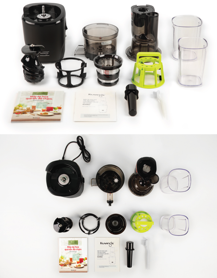 Sách hướng dẫn công thức làm các loại Nước ép, Soup, Mojito, Cocktails, Sinh tố và Kem hoa quả, dụng cụ vệ sinh (chổi xoay và bàn chải), ca đựng nước ép và ca đựng bã ép kèm theo sản phẩm tiện lợi phục vụ những ly nước ép với hương vị phong phú hơn, màu sắc tươi hơn và giữ được toàn bộ dinh dưỡng của trái cây và rau củ quả mà không bị tách nước nhanh cho gia đình bạn.