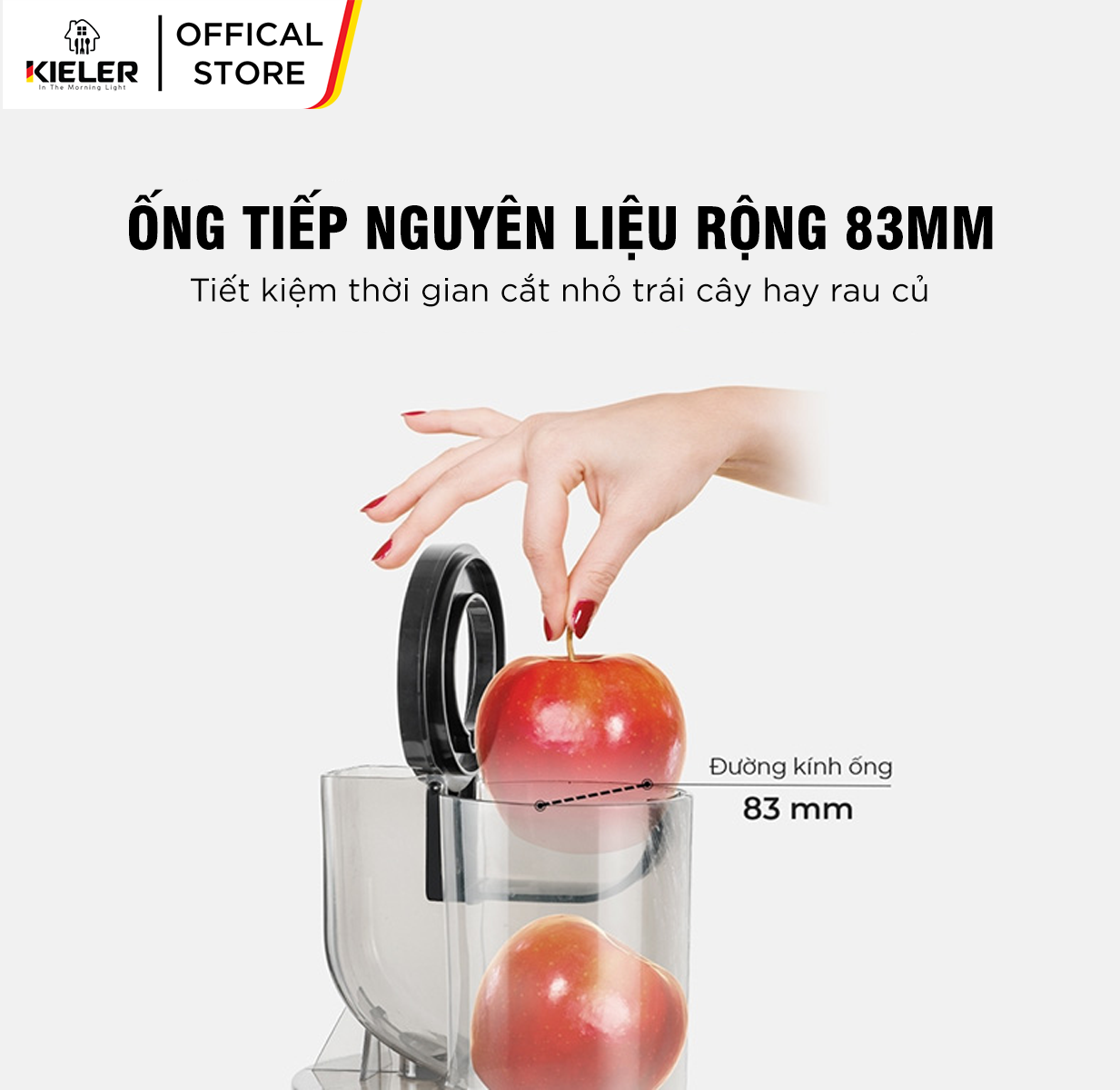• Ống tiếp nguyên liệu rộng 83mm, tiết kiệm thời gian cắt nhỏ trái cây và rau củ khi dùng máy ép.