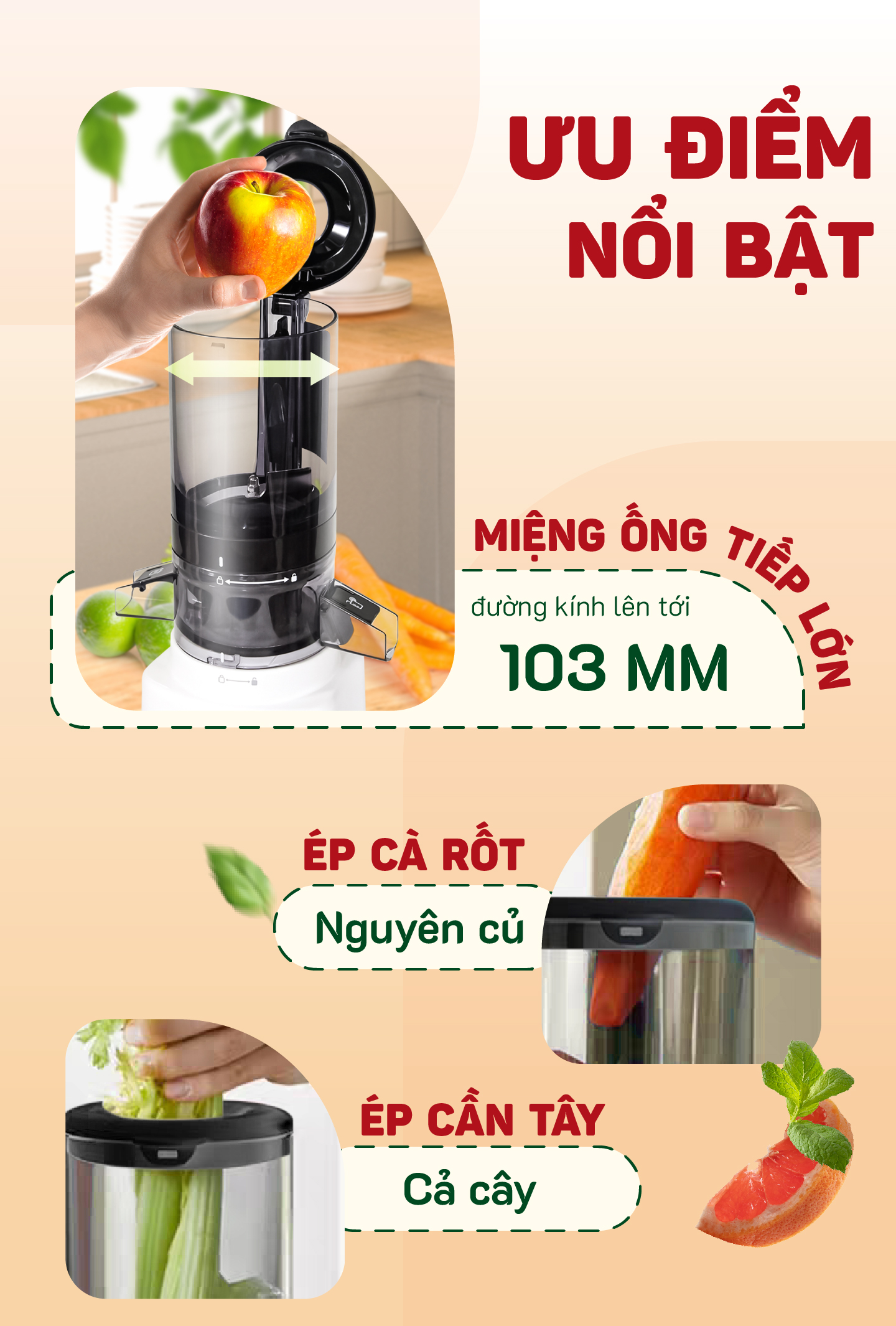 Ngoài ra, MS Healthy thiết kế dung tích lớn có thể chứa tới 600ml nước ép, cho bạn thoải mái mix nhiều loại hoa quả và rau củ. Miệng cối ép to, dao thái thô tiện lợi có thể chẻ (thái) nhỏ nguyên liệu giúp tiết kiệm thời gian chuẩn bị.