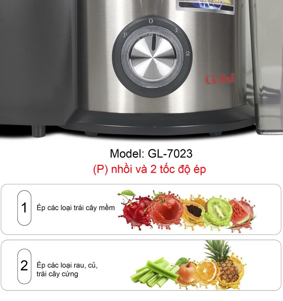 - Máy ép trái cây GL-7023 kiểu dáng hiện đại phù hợp mọi gia đình, điểm kinh doanh. Máy có thể tạo ly nước ép chỉ trong vài giây, ít bị tắc, ít tạo bọt, giữ được tinh chất của các loại trái cây.