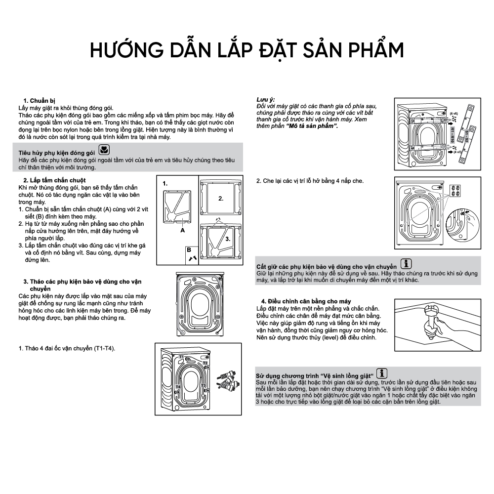 Tổng quan thiết kế - Kiểu dáng: máy giặt lồng đứng - cửa trên. - Bảng điều khiển: nút nhấn có màn hình hiển thị, sử dụng tiếng Việt đơn giản, dễ dùng. - Nắp máy: chất liệu kính