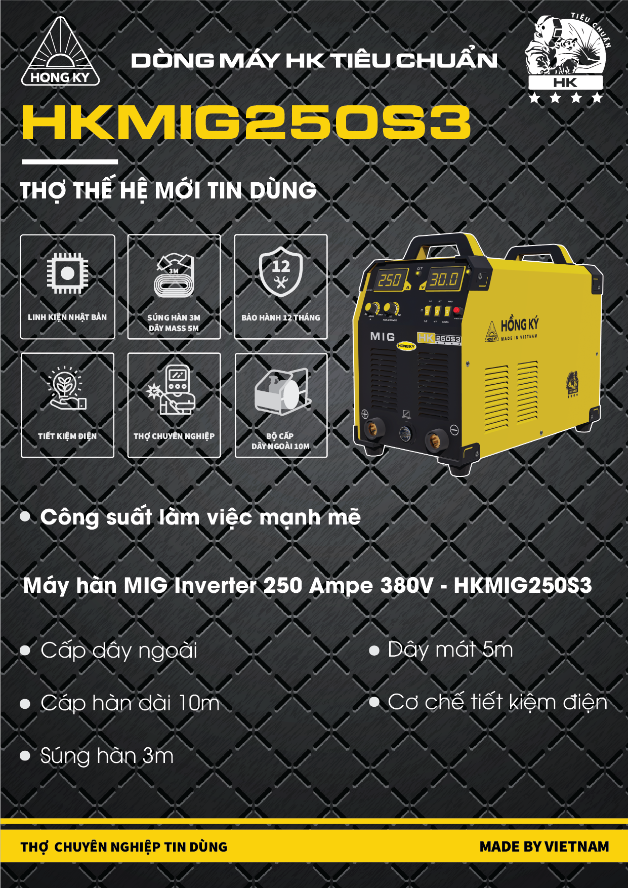 Ưu điểm nổi bật: - Cấp dây trong - Hiệu suất cao - Công suất đúng 250A - Súng hàn 3m - Dây mát 3m - Cơ chế tiết kiệm điện - Hàn công nghiệp