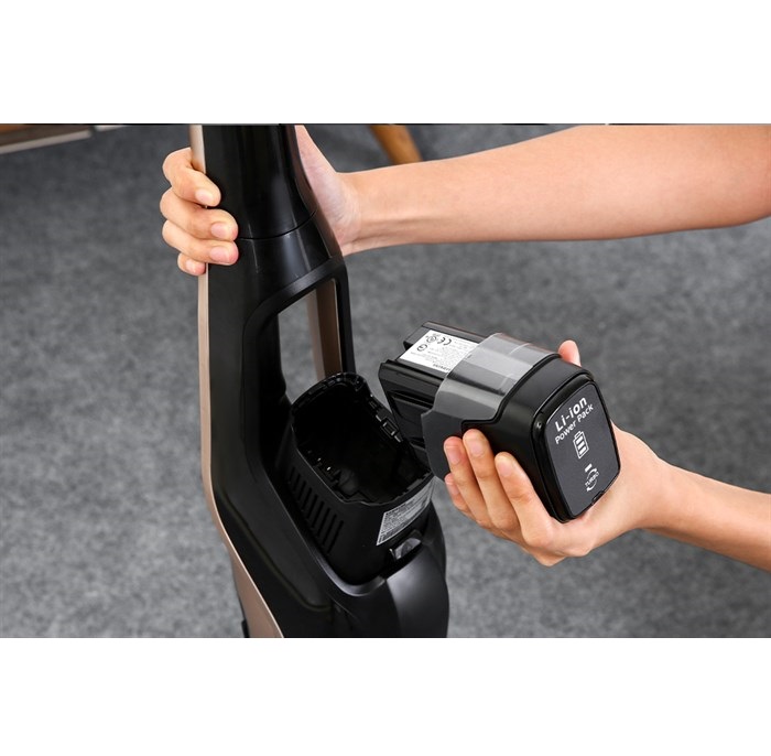 Bộ pin Lithium-Ion 21.6V hoạt động mạnh mẽ giúp máy duy trì lực hút liên tục trong 30 phút, đồng thời gọn nhẹ dễ cầm nắm. Chỉ với một nút nhấn, bạn có thể thay đổi pin sạc mà không cần tắt máy.