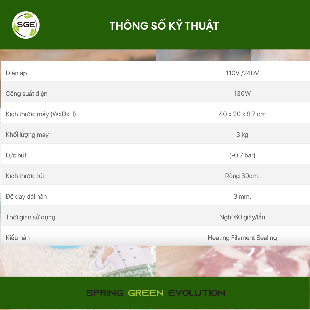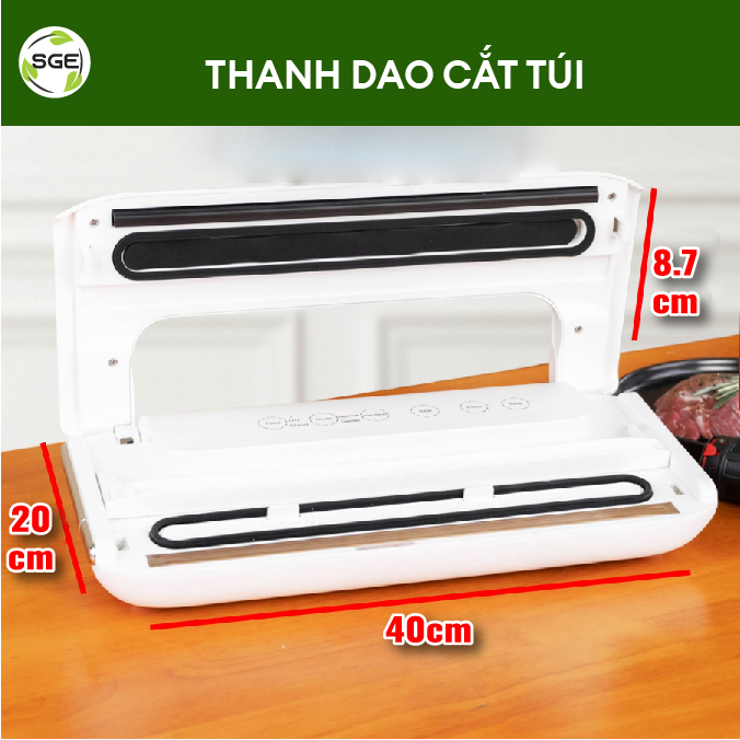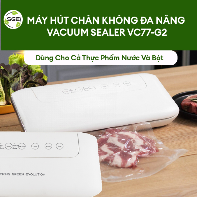 MÁY HÚT CHÂN KHÔNG ĐA NĂNG  VACUUM SEALER VC77     Máy hút chân không VC077 Gen2 là mẫu máy hút chân không gia đình mới nhất. Máy sử dụng được với nhiều loại túi như túi hút chân không, lọ hút chân không và hút chân không chai rượu vang khi sử dụng với phụ kiện đi kèm. Tương thích với các phụ kiện niêm phong bình và chai rượu. Khả năng tương thích với nhiều loại bao bì giúp người dùng có nhiều lựa chọn hơn trong việc thiết kế và sử dụng bao bì sản phẩm.   TÍNH NĂNG MÁY HÚT CHÂN KHÔNG VC77   Có thể hàn miệng túi thông thường và hàn miệng túi hút chân khôngDài hàn rộng hơn, lên đến 30cm hàn được túi lớnTích hợp dao cắt túi dạng cuộn, cắt theo kích thước yêu cầuPhụ kiện đi kèm hỗ trợ hàn nhiều loại bao bì đa dạng KÍCH THƯỚC MÁY HÚT CHÂN KHÔNG VC77     THÔNG SỐ KỸ THUẬT MÁY HÚT CHÂN KHÔNG ĐA NĂNG VC77      REVIEW CÁCH SỬ DỤNG       TẠI SAO NÊN CHỌN MÁY HÚT CHÂN KHÔNG SGE   • Được sản xuất theo tiêu chuẩn EN (Tiêu chuẩn Châu Âu) như EN 60335-1: 2012 + A11: 2014. • Bảo hành 12 tháng. Chi tiết bảo hành • Bảo hành đổi mới trong 7 ngày. Chi tiết bảo hành • Đội ngũ nhân viên giàu kinh nghiệm, tư vấn trong suốt quá trình sử dụng. • Đội ngũ kỹ thuật viên sẵn sàng hỗ trợ, sửa chữa • Kho phụ tùng sẵn có đặt hàng mọi lúc • Giao hàng nhanh toàn quốc • Có thể kiểm tra hàng trước khi giao   ĐẶC ĐIỂM CỦA MÁY HÚT CHÂN KHÔNG VC77   • Máy khỏe hơn, lớn hơn, hàn được túi có kích thước to hơn nhưng khối lượng vẫn nhẹ và di chuyển dễ dàng. • Chiều rộng của dải hàn lên đến 30 cm. • Thiết kế đẹp mắt, đi kèm với màn hình cảm ứng, chỉ cần chạm nhẹ, máy đã sẵn sàng để sử dụng. • Có tích hợp dao cắt cùng với thước đo kích thước túi dễ sử dụng. • Chức năng đa dạng như hàn miệng túi thông thường, hàn miệng túi hút chân không, nút chai rượu vang, ướp thực phẩm, …  • Lực hút mạnh, hút chân không thực phẩm có ít nước tốt hơn. • Tương thích với nguồn điện 220V. LƯU Ý   Kích thước túi nên phù hợp với thực phẩm đựng bên trong, nếu túi quá to khi lưỡi hút hút không khí ra sẽ làm cho hai mặt túi dính vào nhau, lực hút sẽ bị yếu. Chỉ nên sử dụng túi hút chân không mặt nhám khi hút chân không và sử dụng túi nóng/lạnh khi hàn miệng túi. Nên làm sạch máy và khoang bên trong sau khi sử dụng để tránh bị tắc nghẽn. Có thể hút chân không thực phẩm khô và có ít nước nhưng không nên để nước vào máy. (Sẽ làm hệ thống điện bị hỏng và không được bảo hành). Nên để máy nghỉ 1 phút sau mỗi lần sử dụng để bảo quản máy. Nên thường xuyên làm vệ sinh thanh hàn sạch sẽ để thanh hàn không bị cặn cháy, nếu thanh hàn bị đóng cặn cháy nên thay mới ngay để dải hàn đẹp mắt.   Bảo hành đổi mới sản phẩm trong vòng 7 ngày Không nhận bảo hành máy và các thiết bị trên máy khi gặp sự cố do một trong các nguyên nhân sau: