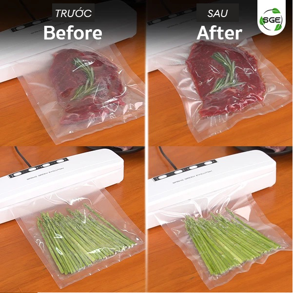 Sử dụng máy hút chân không sẽ giúp hút toàn bộ không khí bên trong túi đựng thực phẩm cũng như hàn kín miệng túi, hạn chế quá trình oxy hóa, sự phát triển của