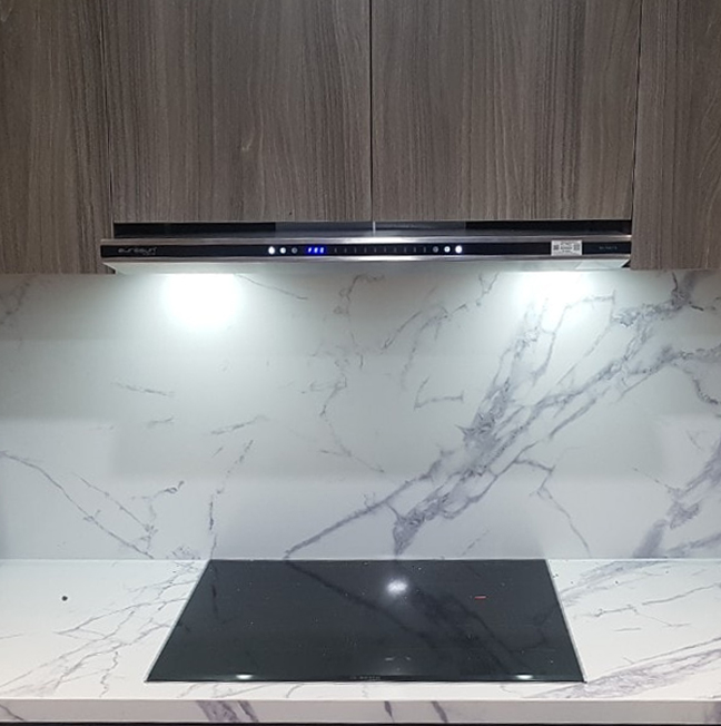 Chất liệu Inox - kính 6mm Điều khiển bằng phím cảm ứng Đèn báo sáng đang hoạt động Ống thoát Ø150mm Đèn Led tiết kiệm điện: 2Wx2 Bộ lọc 1 than hoạt tính và 2