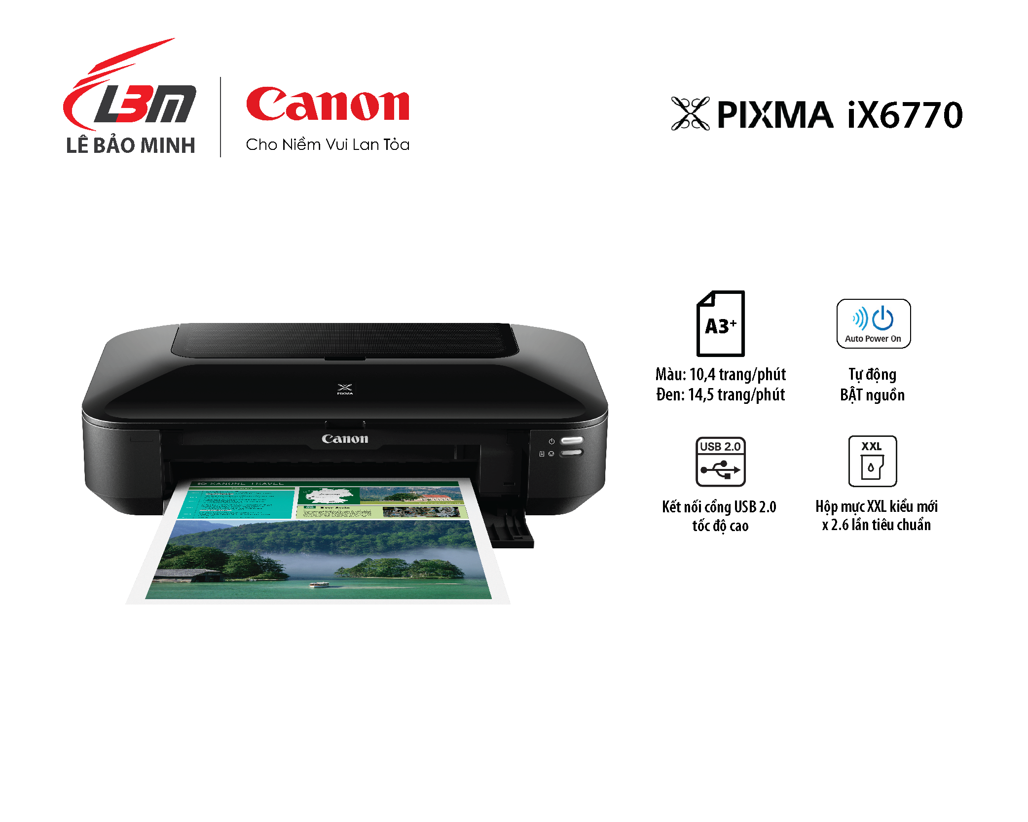 - Lượng bản in khuyến nghị theo tháng: 80 - 200 trang Tính năng Tính năng tự động BẬT nguồn Tính năng tự động BẬT nguồn sẽ dò tìm lệnh in và tự động bật máy in có kết nối USB. Hộp mực riêng biệt kiểu mới Hộp mực XXL kiểu mới có thể in gấp 2,6 lần dung lượng bản in so với các ống mực chuẩn Mẫu giải pháp Bạn có thể tải các mẫu giải pháp được thiết kế riêng (như menu, đề xuất bán hàng và kí hiệu văn phòng khác) cho các mục đích sử dụng riêng biệt với chiếc máy in này thông qua Quick Menu. In tài liệu cỡ A3 Bạn sẽ có lợi thế trong cuộc cạnh tranh kinh doanh. Bởi iX6770 có thể in các bản in khổ rộng có độ phân giải cao và in bản vẽ CAD lên tới khổ A3.