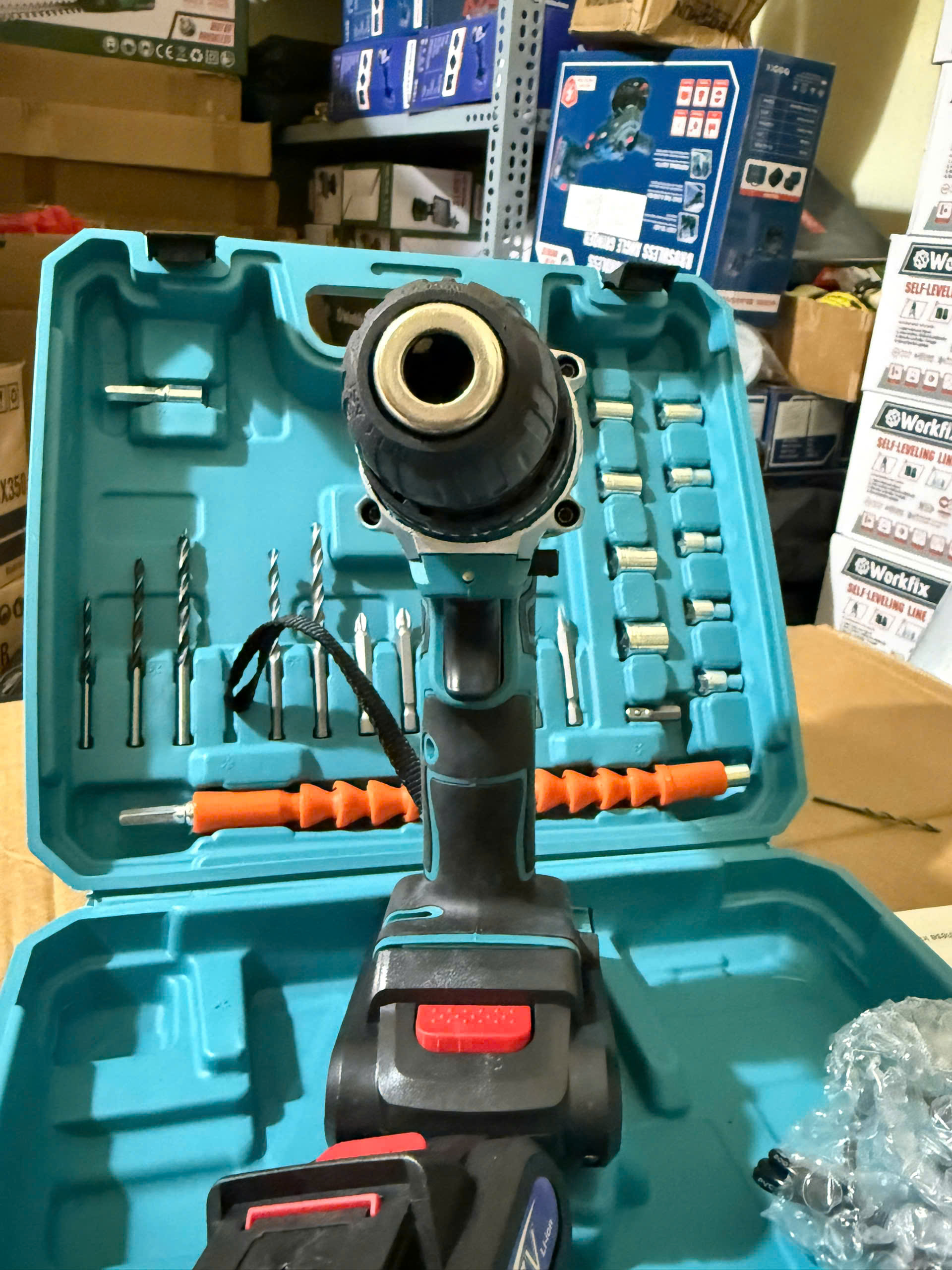 Đèn LED định vị Máy được trang bị đèn LED định vị để sử dụng trong các chỗ khuất, tối Thiết kế phù hợp Máy khoan pin elex 77V dễ dàng sử dụng, thiết kế vừa gọn tay nên rất phù hợp để sử dụng trong sửa chữa, lắp đặt gia đình cũng như thi công ở công trình. TẶNG BỘ PHỤ KIỆN 24 CHI TIẾT MÁY KHOAN PIN mkt 77v tặng kèm bộ phụ kiện gồm 12 mũi bắt vít các đầu vuông, phillip, sao hoa thị... 9 đầu khẩu từ 3-15mm và 1 dây nối bắt vít chỗ hẹp.